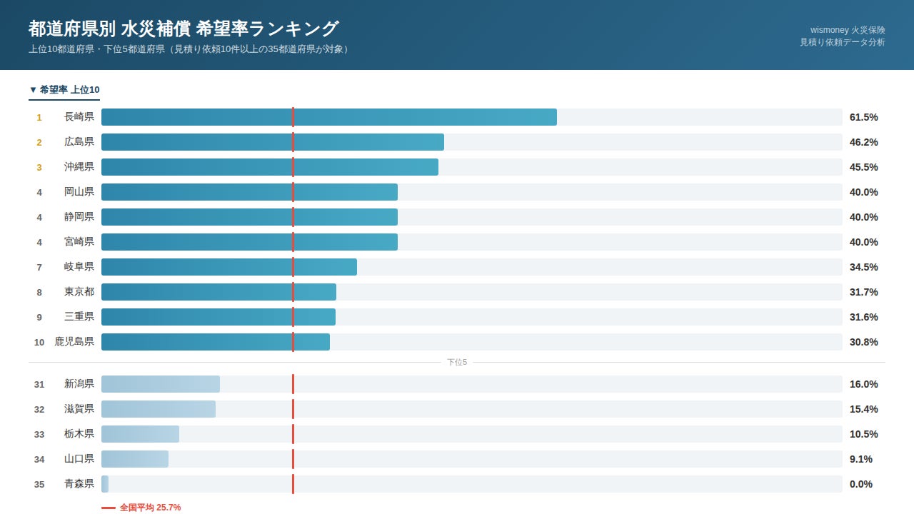 Mt.flowers株式会社(本社:東京都江東区)が運営する火災保険一括見積りサービス「wismoney(ウィズマネ)」は、2025年2月〜2026年1月に寄せられた見積り依頼データをもとに、都道府県別の補償希望率を分析しました。