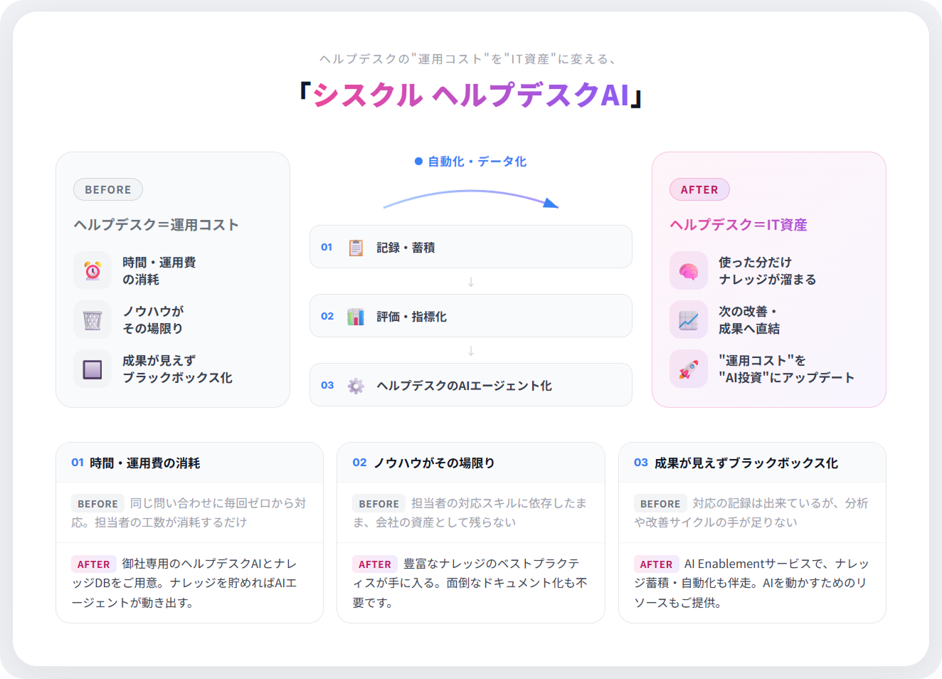 本サービスは、ヘルプデスク業務をコストセンターというイメージから脱却させ、蓄積・活用可能な「IT資産」へと転換することを目指しています。また、AIヘルプデスクの構築・運用に課題を抱える企業に向けた伴走支援サービス「シスクル AI Enablementサービス」も同時提供を予定しています。