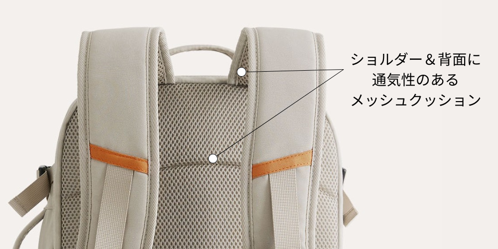 背面クッションとショルダーストラップには荷重分散構造を採用。