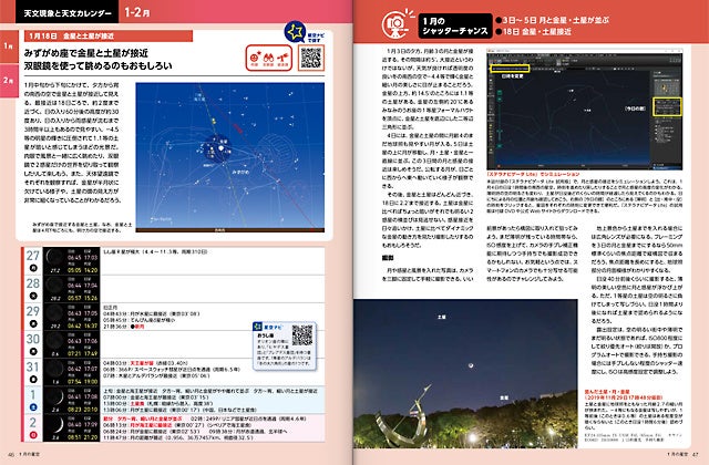 2025年注目現象の見どころや、毎月の星空の様子を先取りできます。特集記事では2025年に観望したい天文現象を写真とカラーCGイラストで解説。スマホアプリ「星空ナビ」があれば二次元コードを読み取って天文現象の方向を調べるなど、さらに便利に楽しめます。見ごろの星座・天体や二十四節気のコラムも掲載しています。