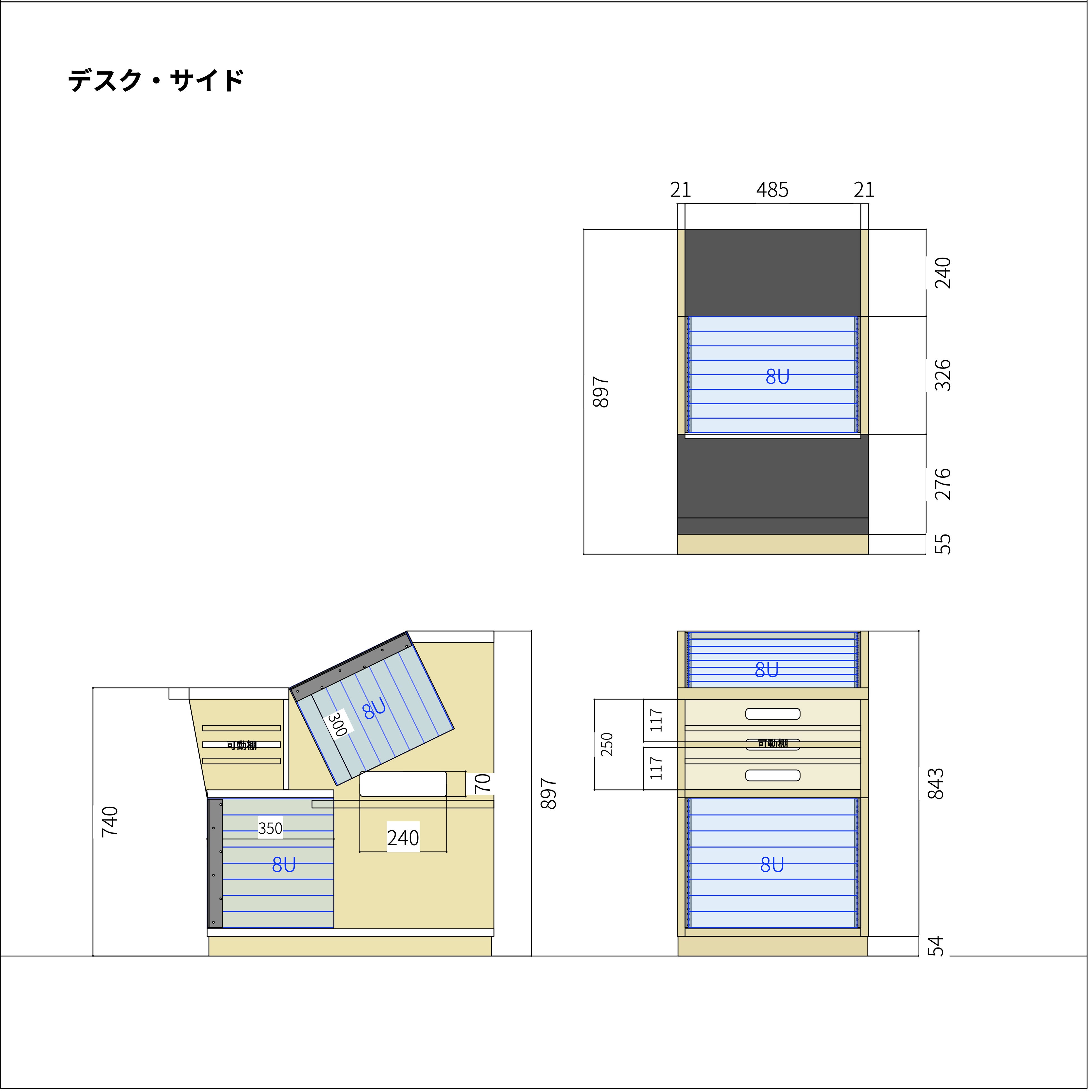 サイドラック下部には8Uラックスペース。その上部にフレキシブルに⾼さを変更できる収納スペースを