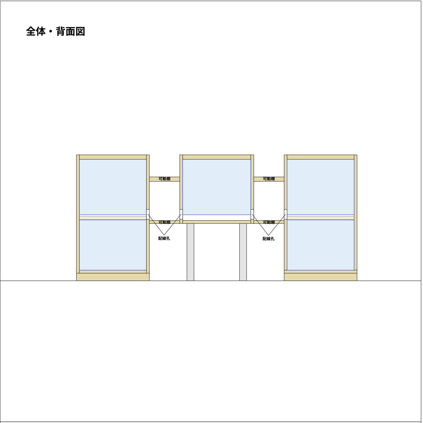 家具背⾯は端から端まで配線が通せる仕様に。中央上部にはモニターアーム取付⽤の棚板を設け、モニターの位置調整が可能。