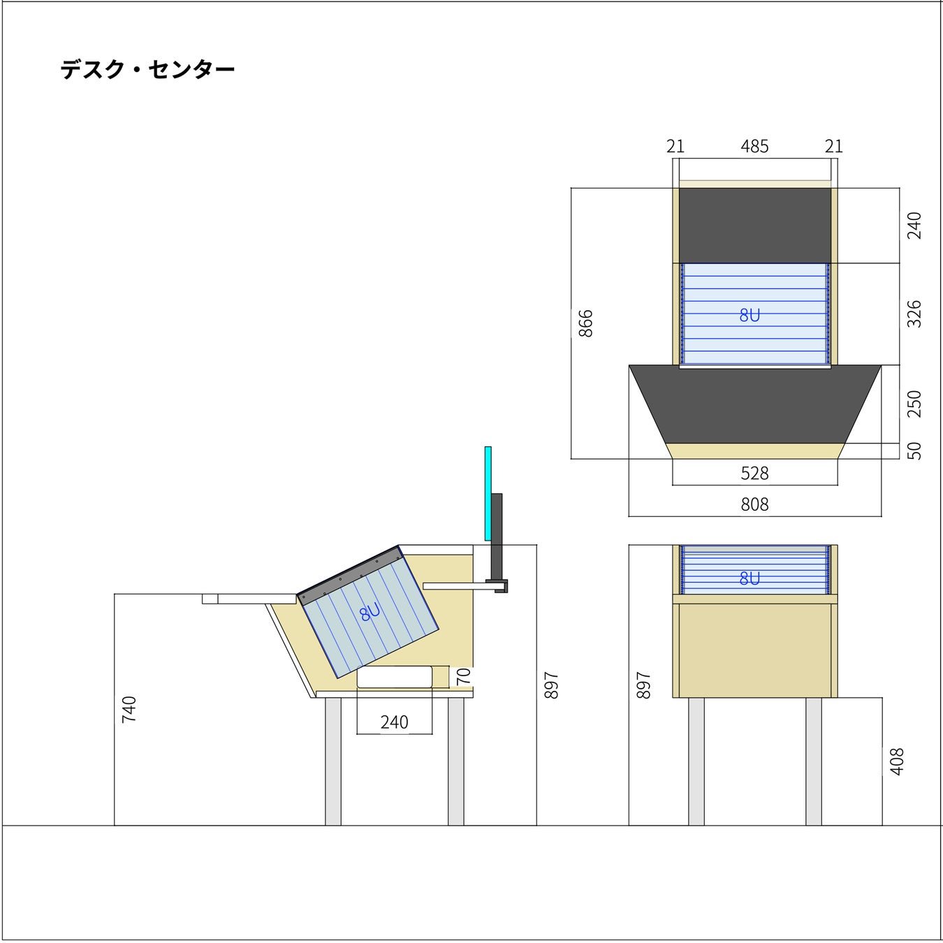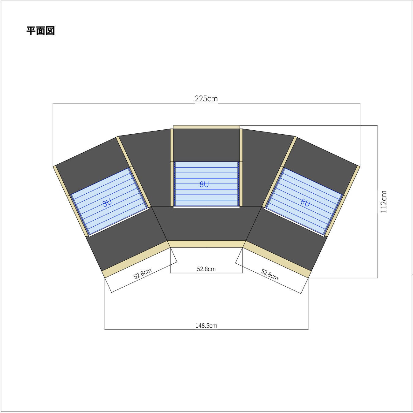 左右の機材にもアクセスしやすい扇型デスク。ラック上部、そして奥の余白部分にも天板を備えより広く使える仕様に。