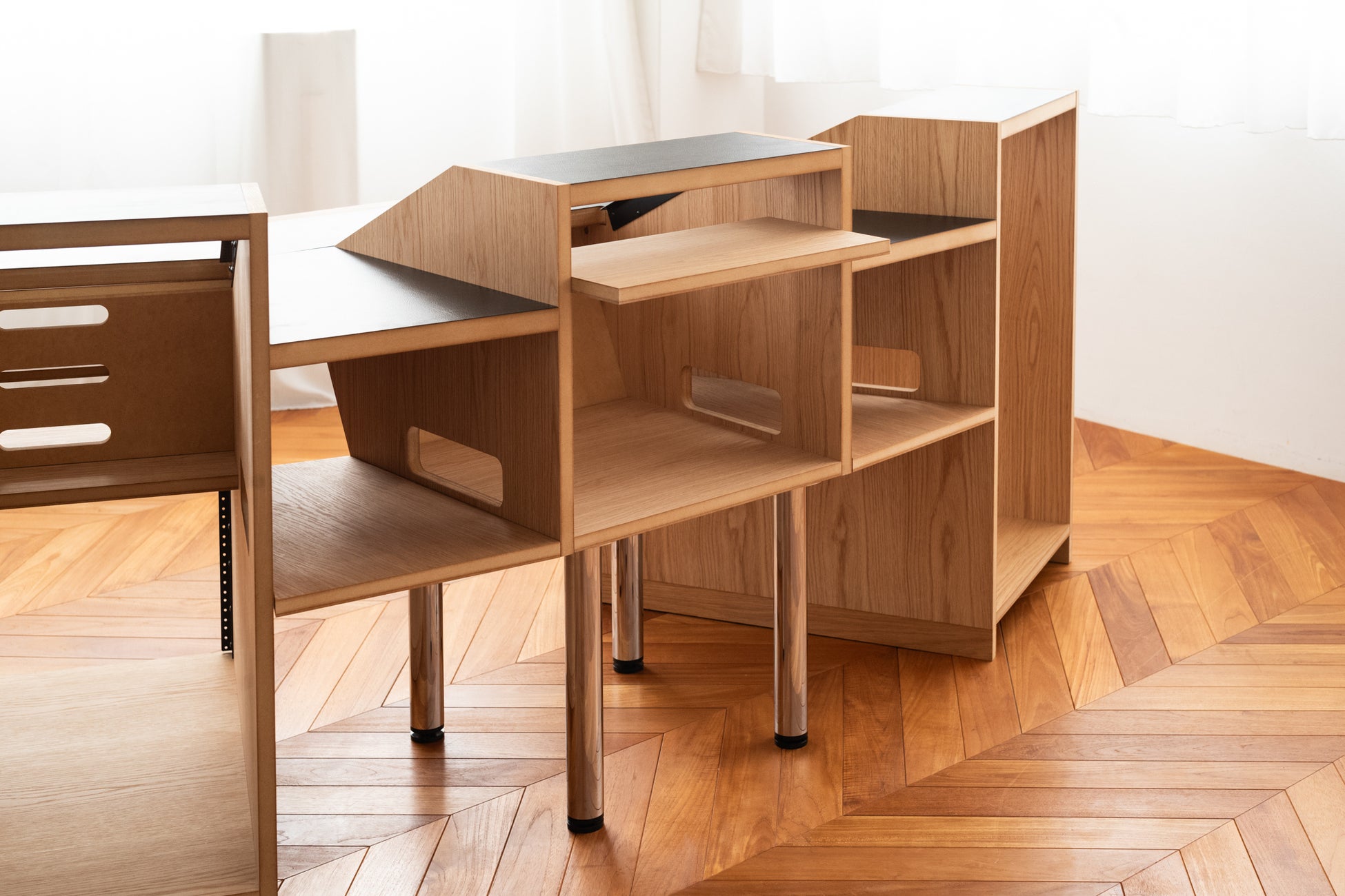 左右のラックは足下にゆとりを持たせるため斜めにセットバック。中央ラック下部は円柱型のスチール脚を採用しスッキリした印象に。