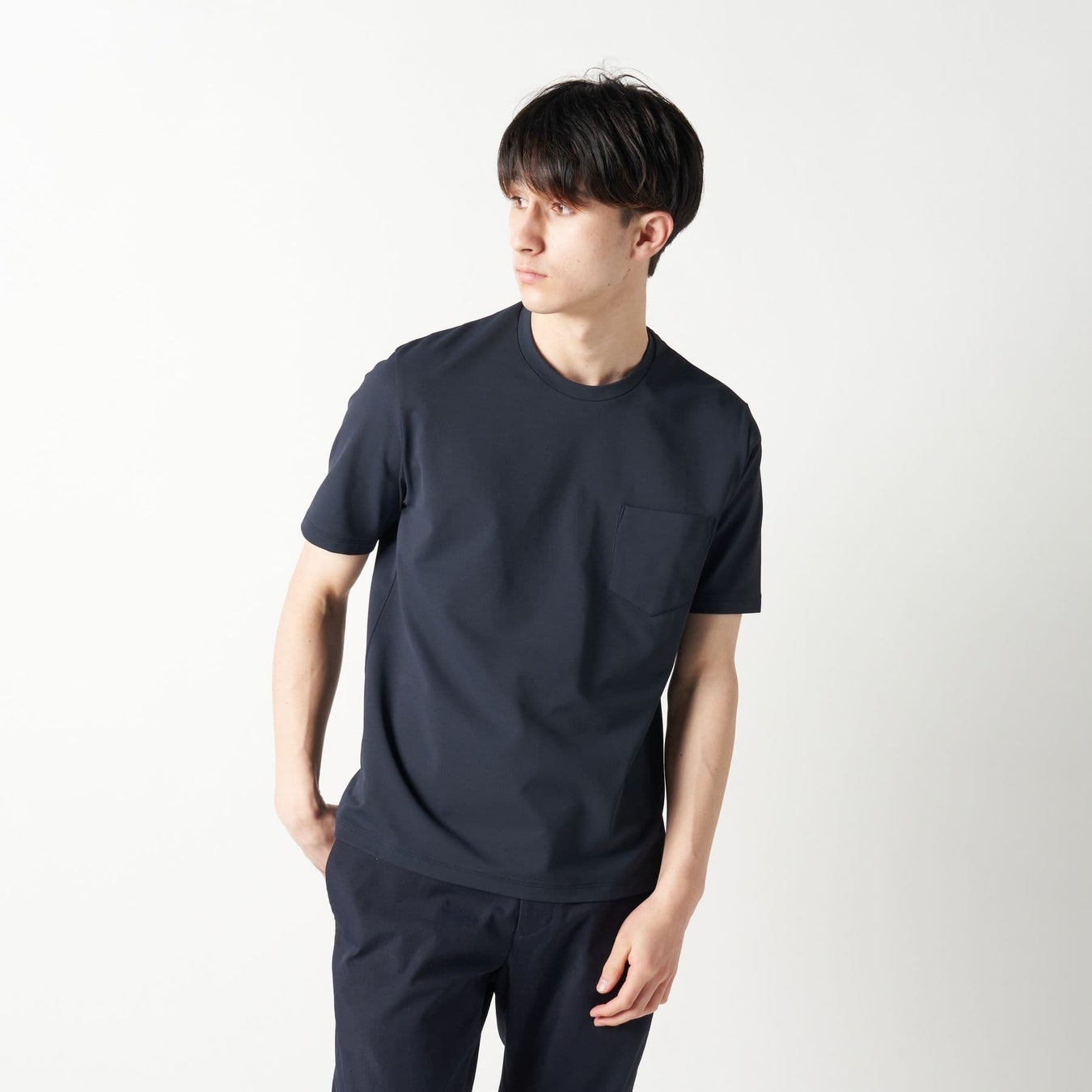 一見するとよくあるクルーネック&VネックのTシャツですが、どちらもジャケットを羽織ることを想定して作られたジャケットインTシャツです。クルーネックはだらしなくないよう首回りにフィットし、Vネックも浅めの仕様で上品に。ジャケットの下に着るTシャツとしてビジネスシーンでも取り入れやすく、すっきりとした印象を与える仕様です。