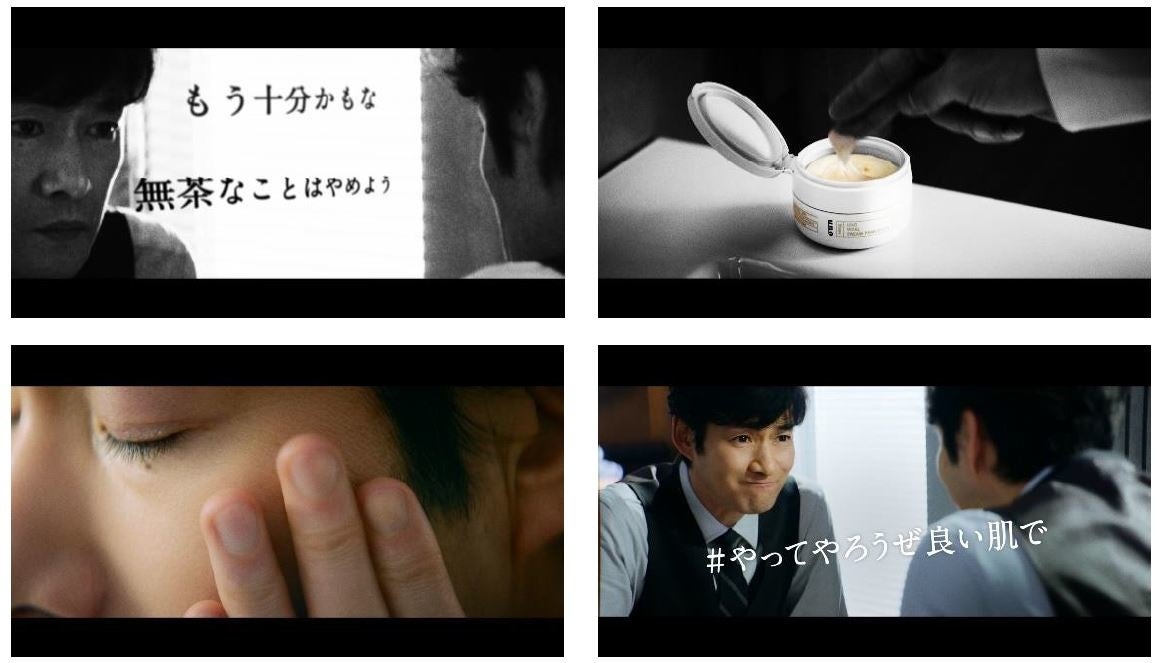 しかし、「ウーノ」のオールインワンを指ですくってスキンケアをした瞬間、画面は鮮やかに色彩を取り戻し、たちまち3人の心にポジティブなスイッチが入ります。毎日の習慣であるスキンケアは、闘うビジネスマンにとってギアチェンジの儀式。瑞々しくシャキッとした肌で、3人はまた、ビジネスの戦場へ前向きに向かっていきます。