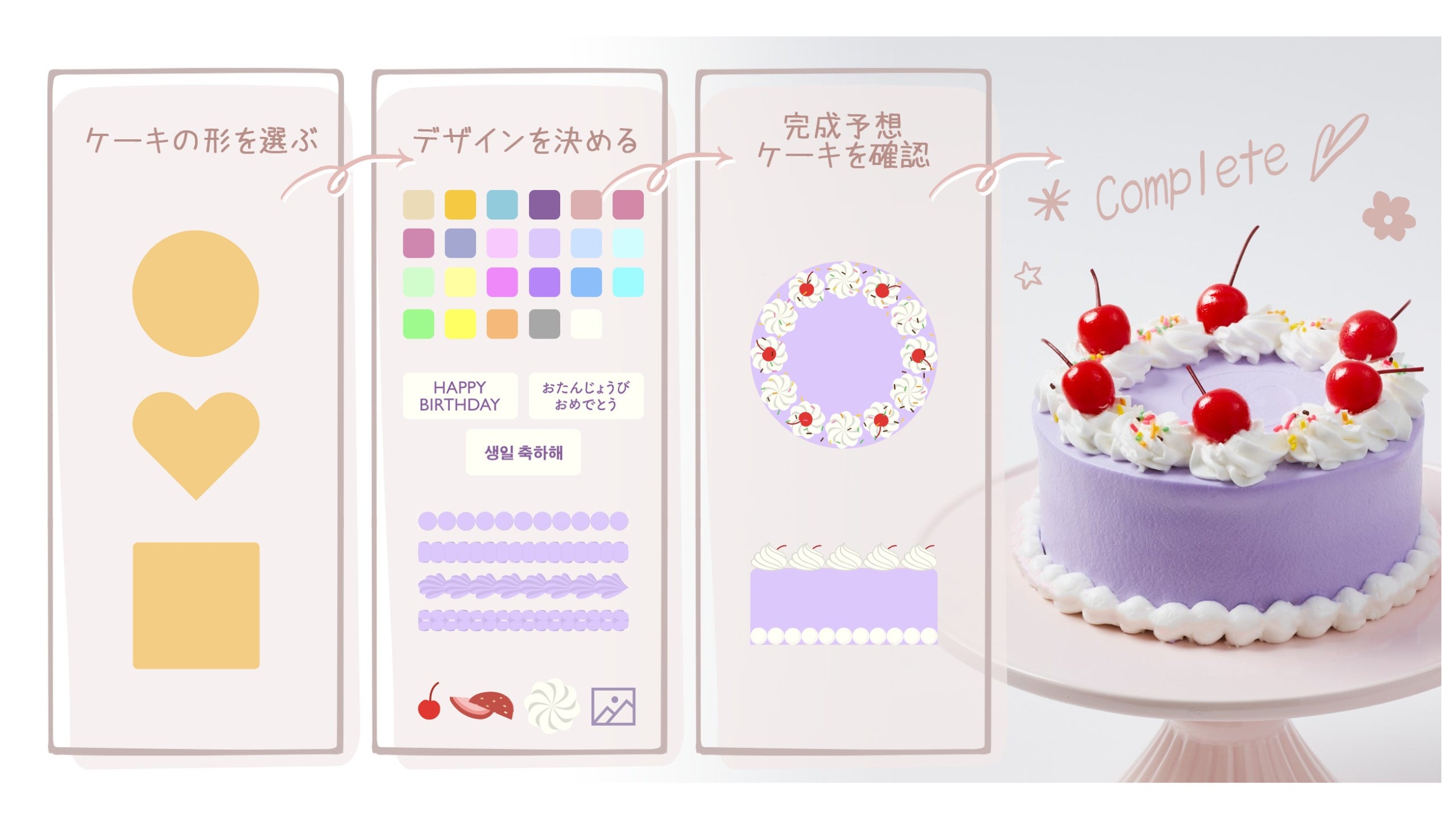 Cake withは自宅のPCやスマホから公式サイトへアクセスし、自分だけのオリジナルケーキをカスタマイズ&オーダーできるシステムです。