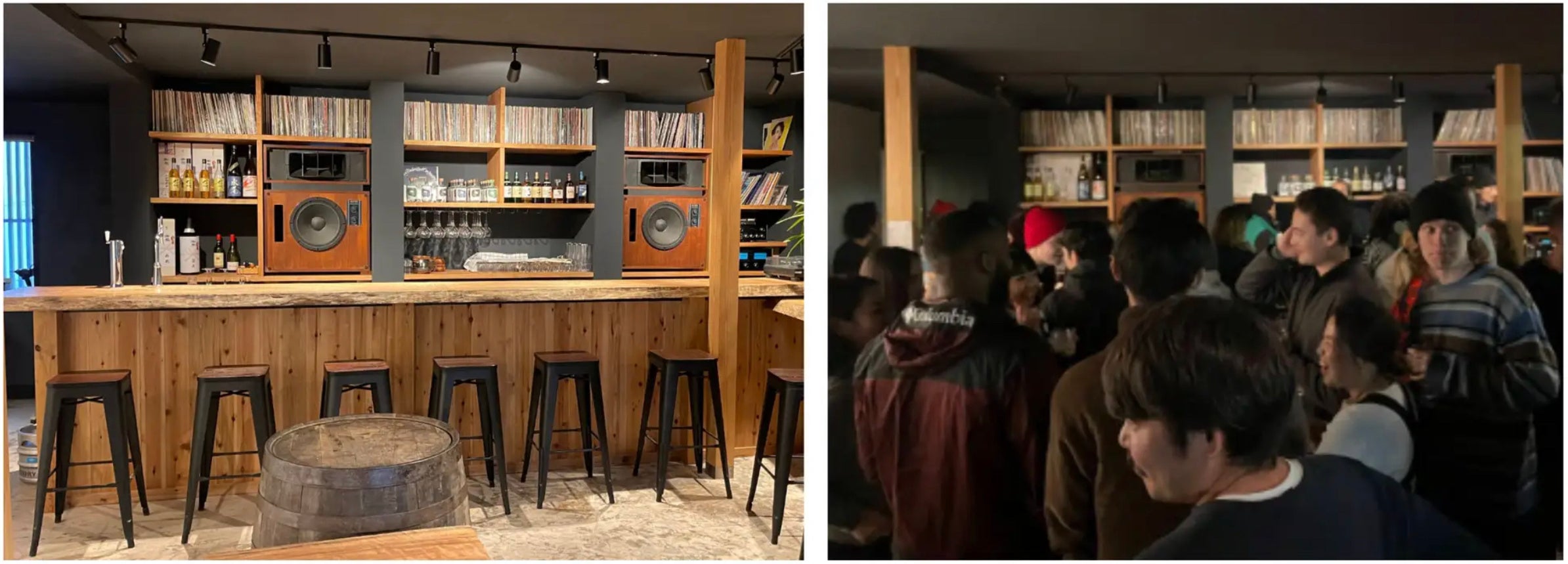(左)遊休不動産を改築したミュージックバー「GURUGURU」(右)賑わう店内の様子