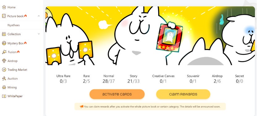 例えば、にゃっちーず(Nyathees)の場合、ストーリーカード(Story)を33種類集めると、にゃっちーずオリジナル漫画NFTが貰える仕組みとなっている。