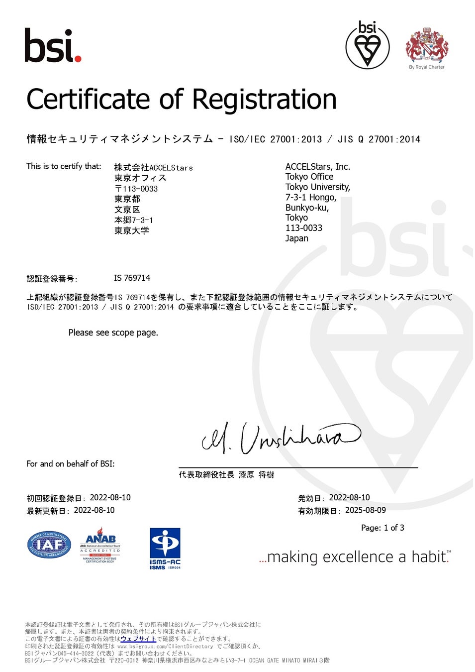 東京大学医学部発のMedical Sleep Techスタートアップである株式会社ACCELStars(アクセルスターズ)(本社:福岡県久留米市、代表取締役社長:宮原禎、以下、「ACCELStars」)は、ISMS(情報セキュリティマネジメントシステム)の第三者認証基準である国際規格「ISO/IEC 27001:2013(JIS Q 27001:2014)」を8月10日に取得しましたのでご報告申し上げます。
