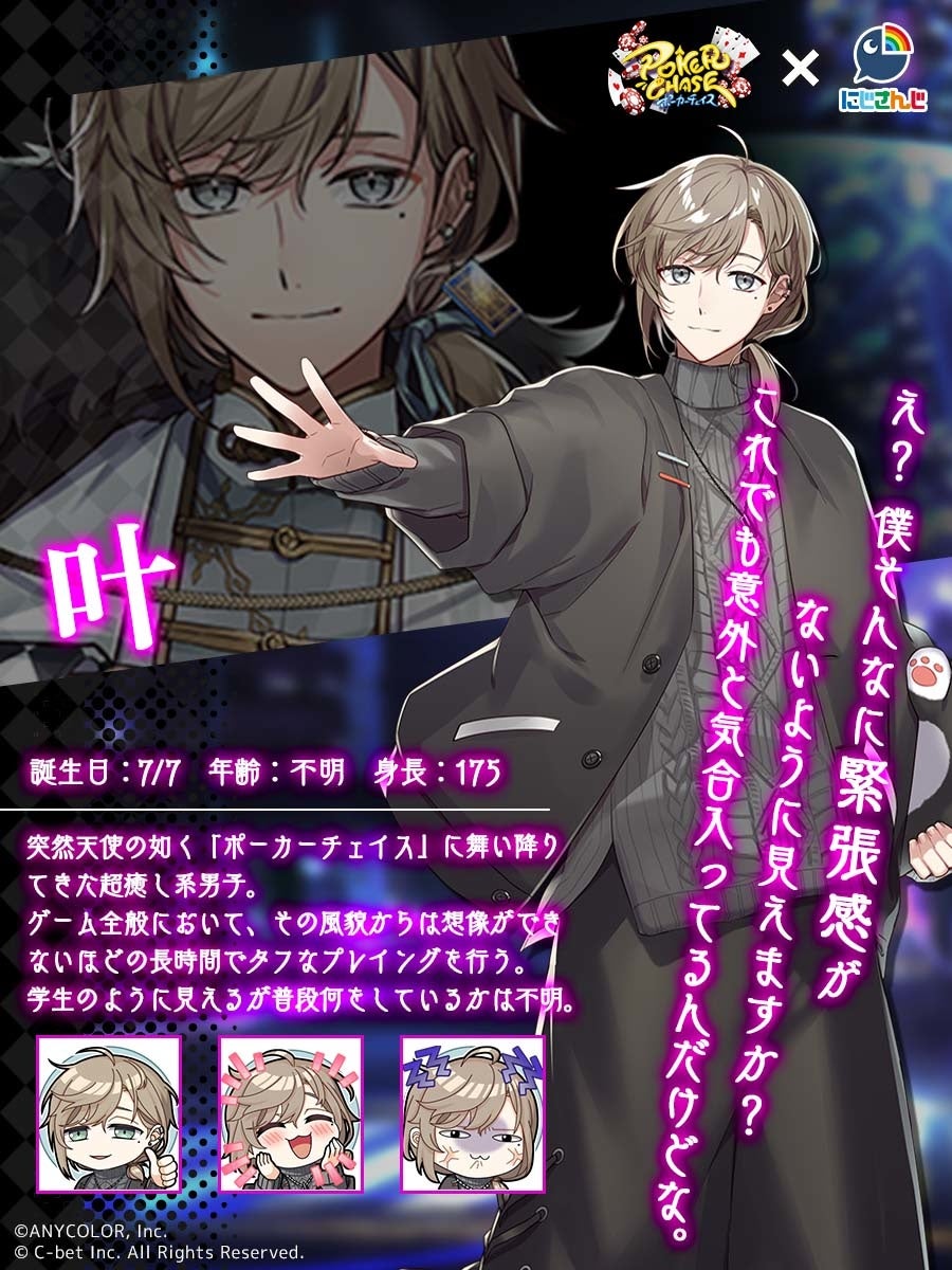 株式会社C-bet(東京都渋谷区、代表:田谷野 貴正、https://c-bet.co.jp/)は、バトロワ式オンラインポーカーゲーム『ポーカーチェイス』と人気バーチャルライバーグループ「にじさんじ」との復刻コラボイベントが本日7月28日(木)よりスタートしたことをお知らせします。