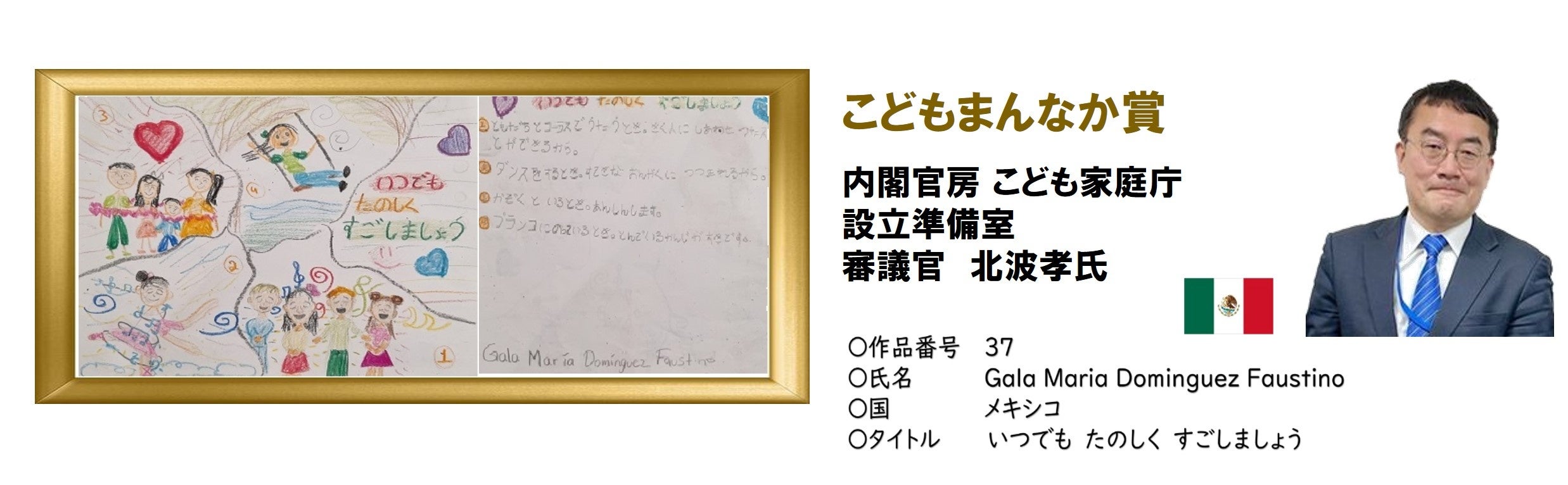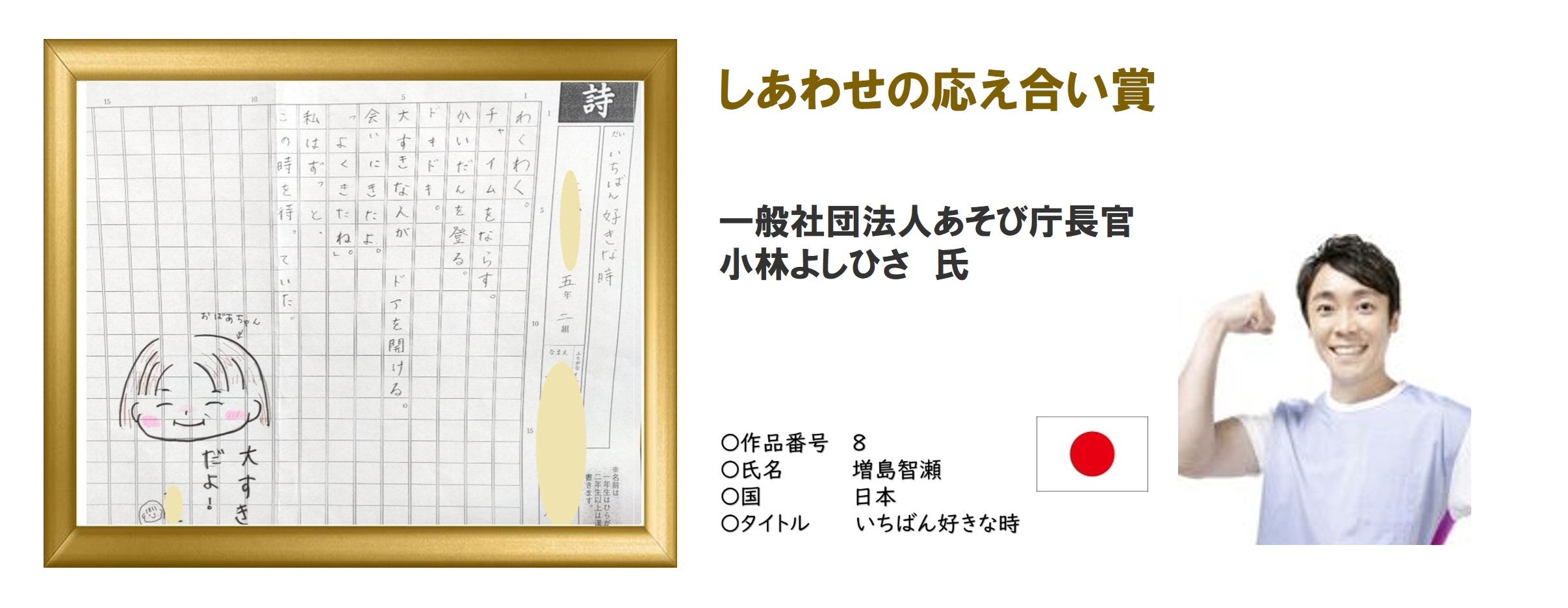 「こどもまんなか」って何だろう?国の仕組みをこども中心にすること?大人たちがいつもこどもたちの健やかな育ちを支え、見守ること?それもそうなんだけれど、大切なのは、こどももおとなも、生きていく中で様々なかたちの幸せを見つけ、それが周囲からも大事にされ、積み重ねていける社会ではないでしょうか。どの作品もそれぞれの幸せのかたちがあふれています。どれも大切なもので、みんなに賞をあげたい。でも、一つ選ぶということなので、「こどもまんなか社会」は、そんなこどもたちみんなのそれぞれの幸せが集まり積み重ねられる社会であってほしいと思い、この作品を選びました。