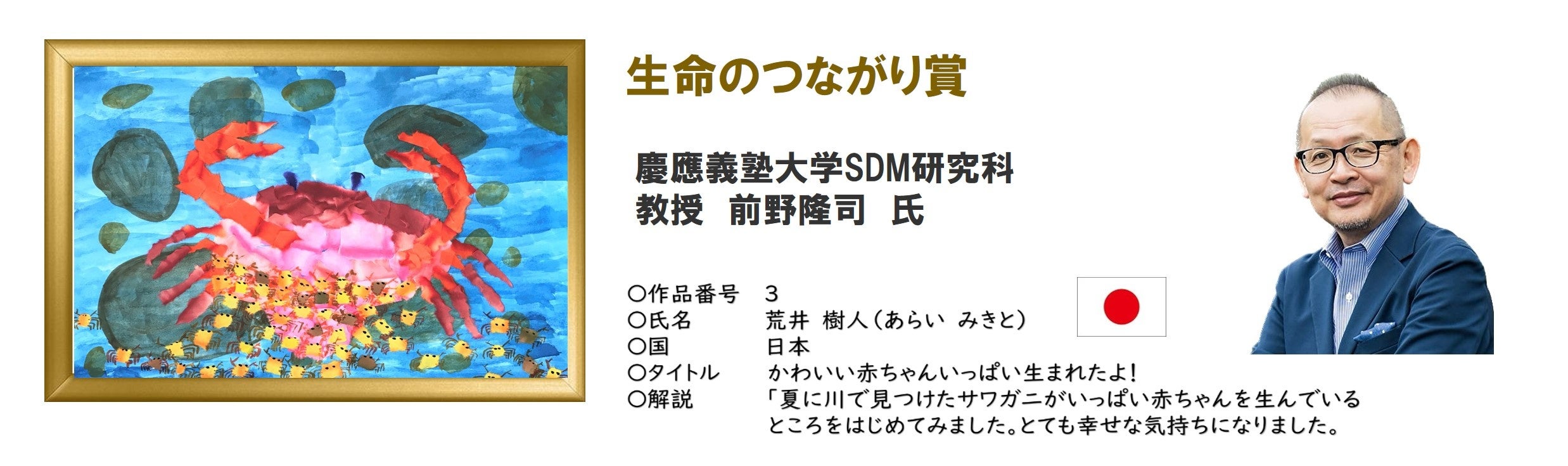 カニの出産という生命の神秘に感動し、それを鮮やかで美しい絵で描きました。青黄赤緑。絵の色彩も大胆さも美しく、お母さんカニの力強い愛と子供のカニの可愛らしさを詳細まで書き込んだ想いが伝わってきました。この絵には引き込まれます。感動がこちらにも伝わってきます。地球上の生きとし生けるものの幸せを願い、生物多様性を維持していきたいですね。