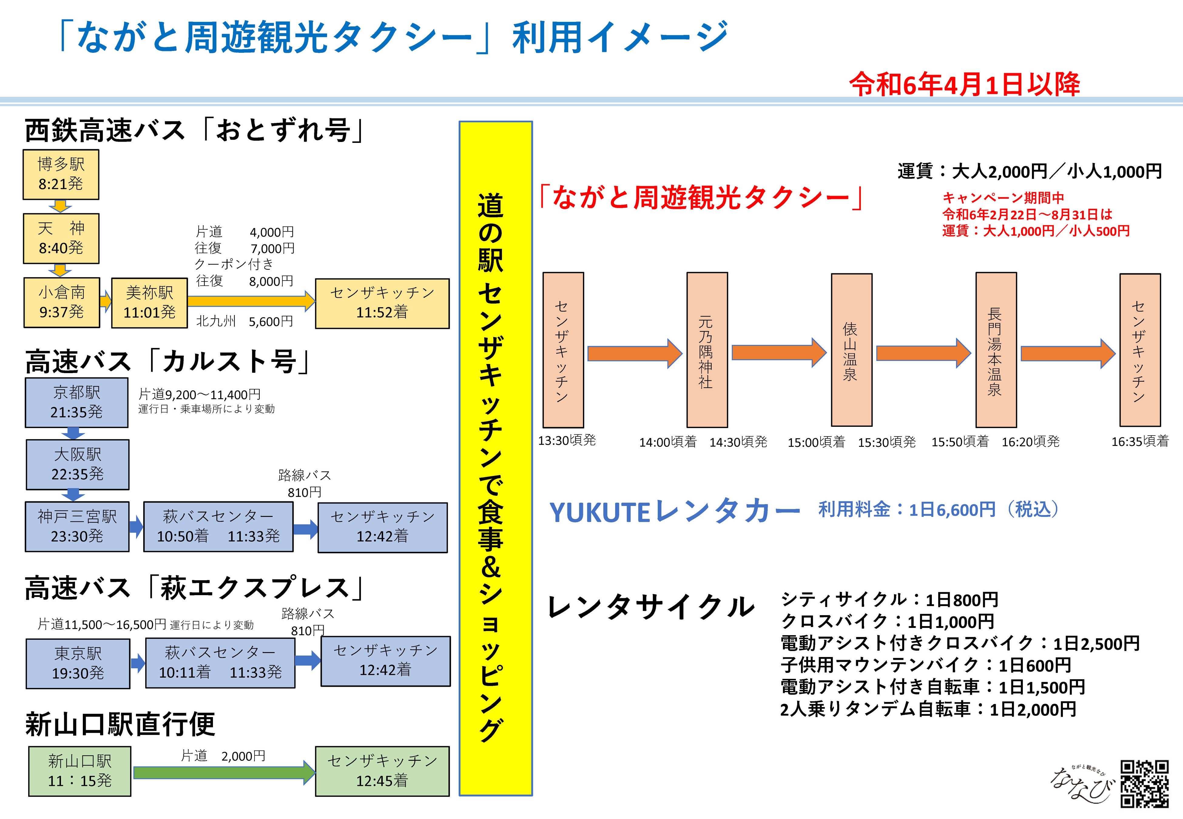 道の駅センザキッチンは、博多・天神バスターミナルから市内に直行する西鉄高速バス「おとずれ号」やJR新山口駅からの直行バスも停車しますので、ながと周遊観光タクシーと組み合わせることで便利に長門市の観光スポットを巡ることができます。
