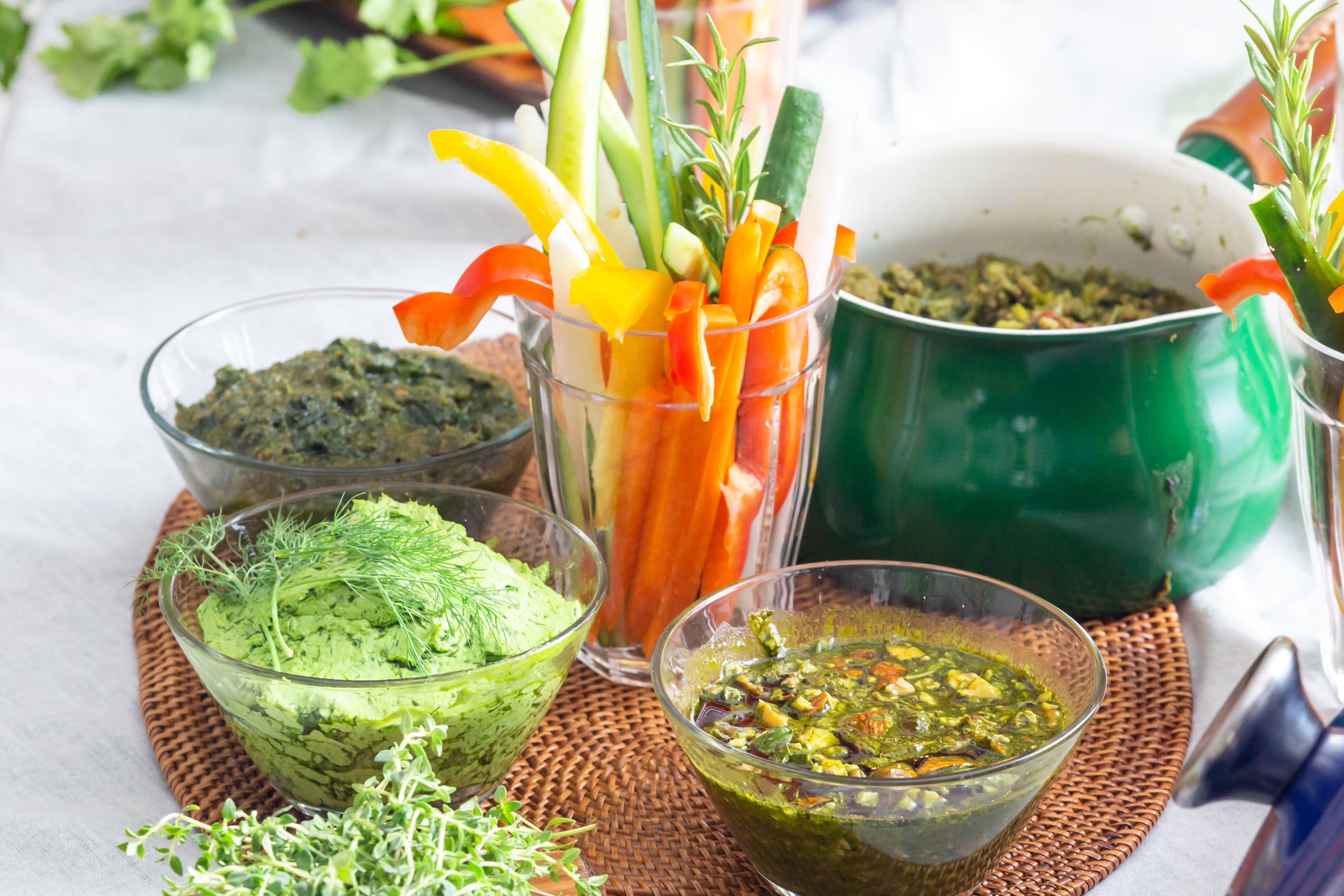 ・4種の抹茶&ハーブマリアージュソースに野菜スティックやバゲットを添えて