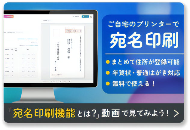 宛名印刷機能があるので、手軽に宛名の印刷まで完了することができます。一度住所を登録しておけば、来年以降も使い回しできるのでとっても便利です!CSVにも対応しているので、お手持ちの住所録をインポートして使用する事も可能です。