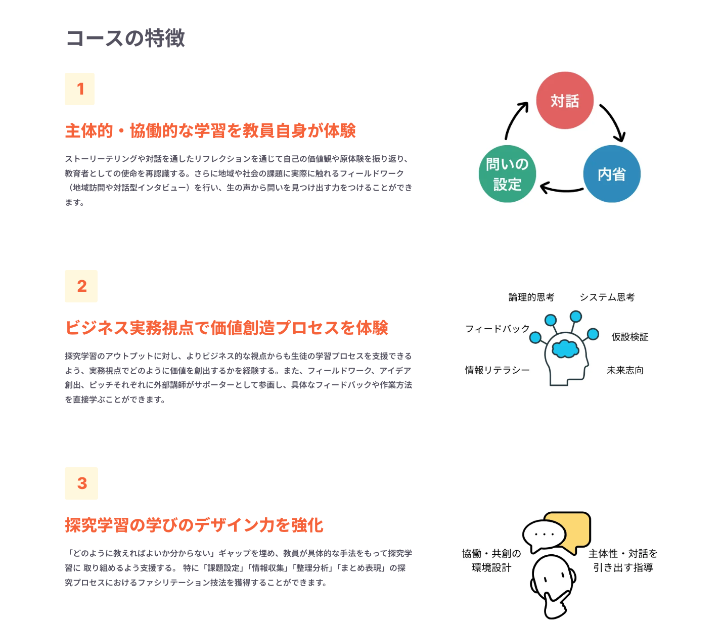 本プログラムでは、「問いを立てる力」「価値を創造する力」「協働的に学び合う姿勢」といった探究の核となる力を、教師が自ら体験しながら習得できるよう設計されています。これにより、探究学習の質的転換を図るとともに、学校現場で持続的に実践をリードできる人材の育成を目指します。