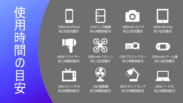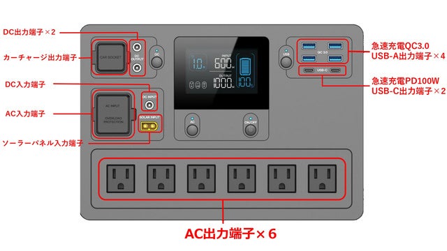 4つの充電方式(コンセント・ソーラーパネル・シガーソケット・発電機)を備え、コンセントからは約2時間30分でフル充電が可能。出力口は汎用性の高いDC製品(USB2.0・QC3.0・Type-C )ほぼ全てに対応し、AC出力口は100V6個を設けていて合計15のデバイスの同時利用が可能です。