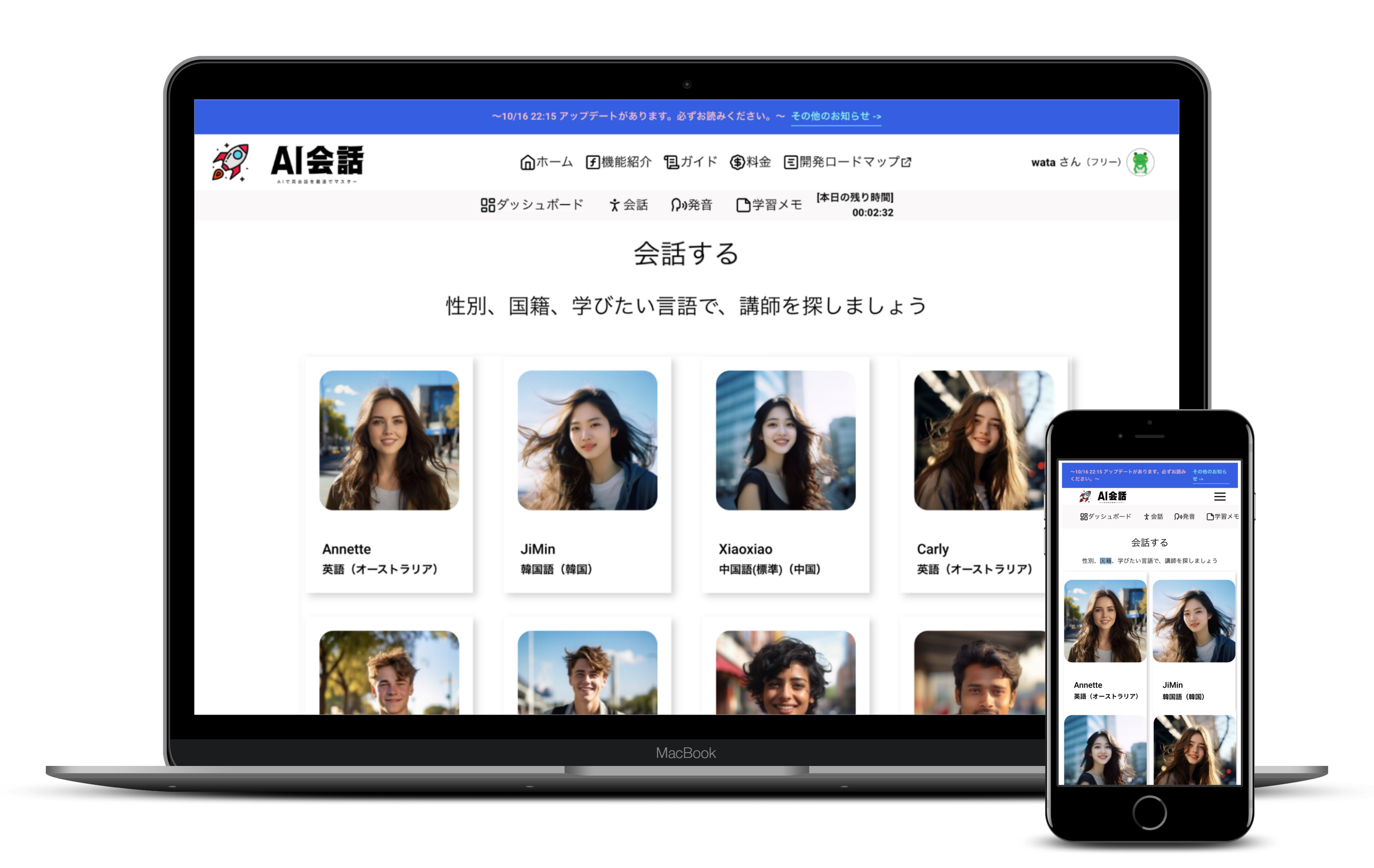 ChatGPTやwhisperといった最新のAIを搭載しており、現在英語、中国語、韓国語など、18以上の言語、地域、アクセントに対応したプロのAI講師が多数所属しています。