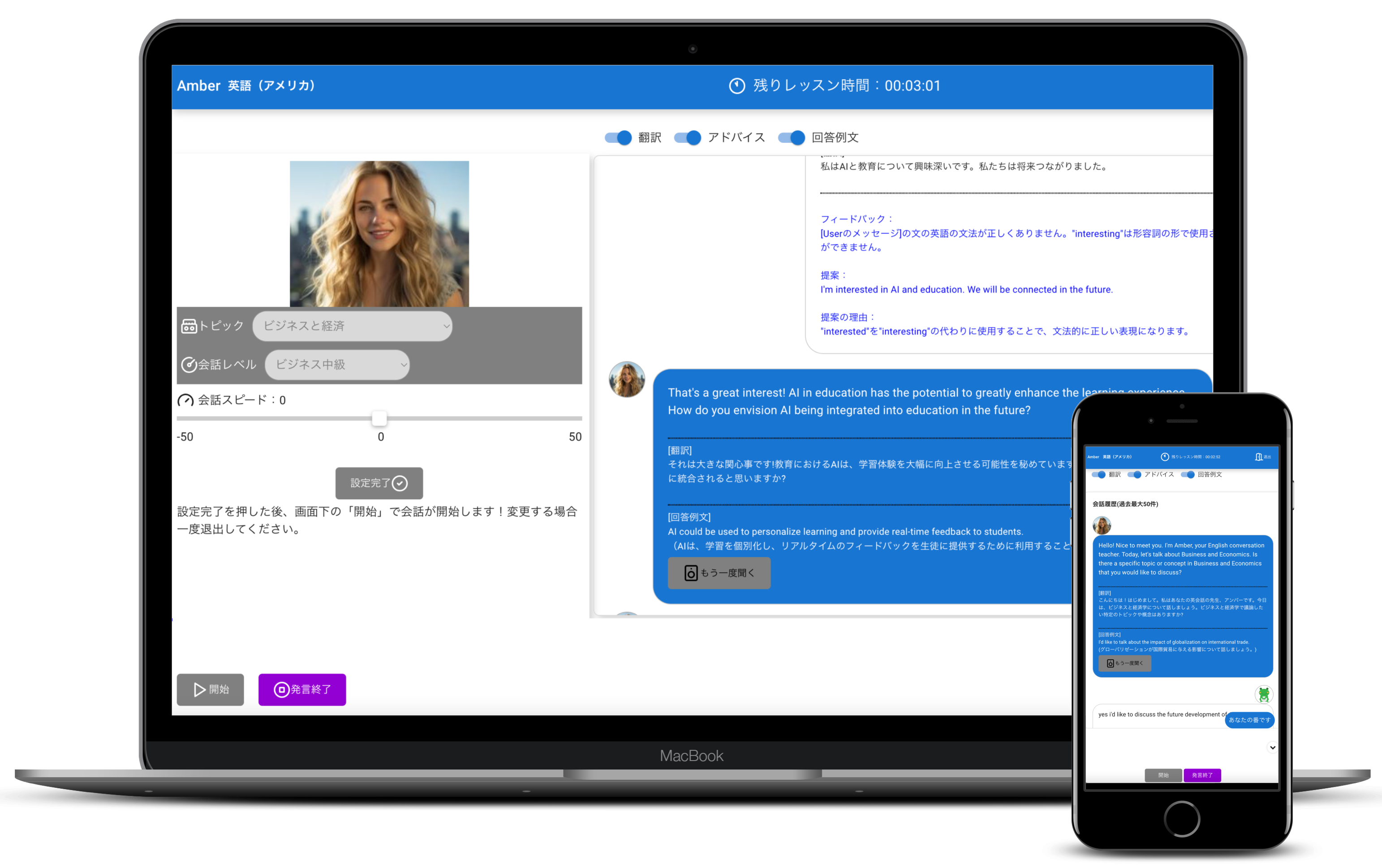 AI会話は、リアルタイム文字起こし+添削付の、AI講師による多言語学習サービスです。