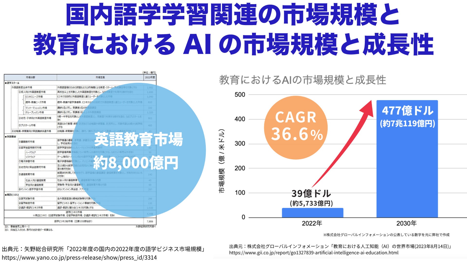 矢野総合研究所によると、国内の語学ビジネスの市場規模は2022年度で7,806億円で、COVID-19後の変化したビジネス環境において、教育におけるAIの世界市場規模は、2022年に39億米ドル(約5,733億円)と推計されております。