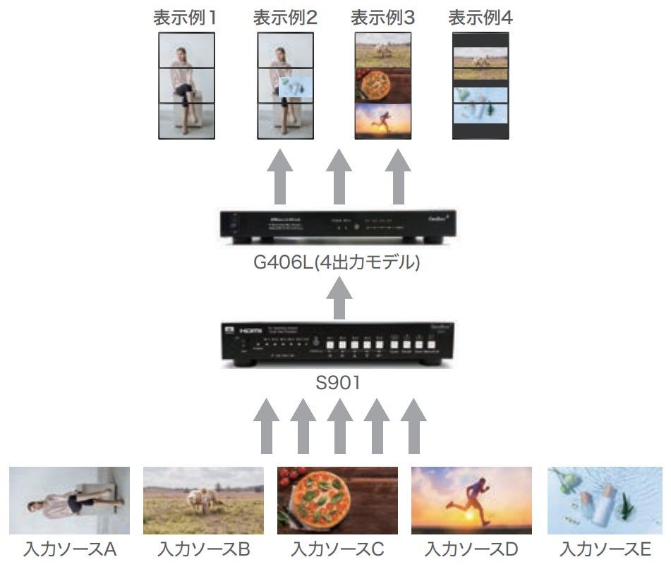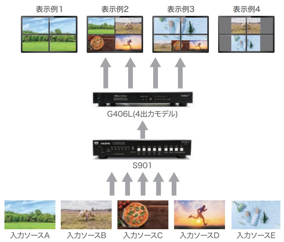 GeoBoxマルチディスプレイコントローラー『G406L』と組み合わせることで、多彩な表示が可能なビデオウォールシステムを構築できます。それぞれ、表示例1は『G406L』単体で実現できますが、『S901』と組み合わせることで表示例2~4のように複数の入力ソースを各ディスプレイに表示できます。