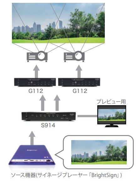 GeoBoxエッジブレンディングプロセッサー『G112』(1出力モデル・2022年末発売予定)と組み合わせて、コストを抑えたマルチプロジェクションシステムを構築できます。