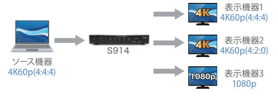 本機の出力端子に接続された表示機器ごとのEDIDを分析し、4K→フルHDダウンスケーリング、4:4:4→4:2:0カラー変換を自動で行います。4Kと1080p対応モニターが混在した接続環境でも分配出力が可能です。