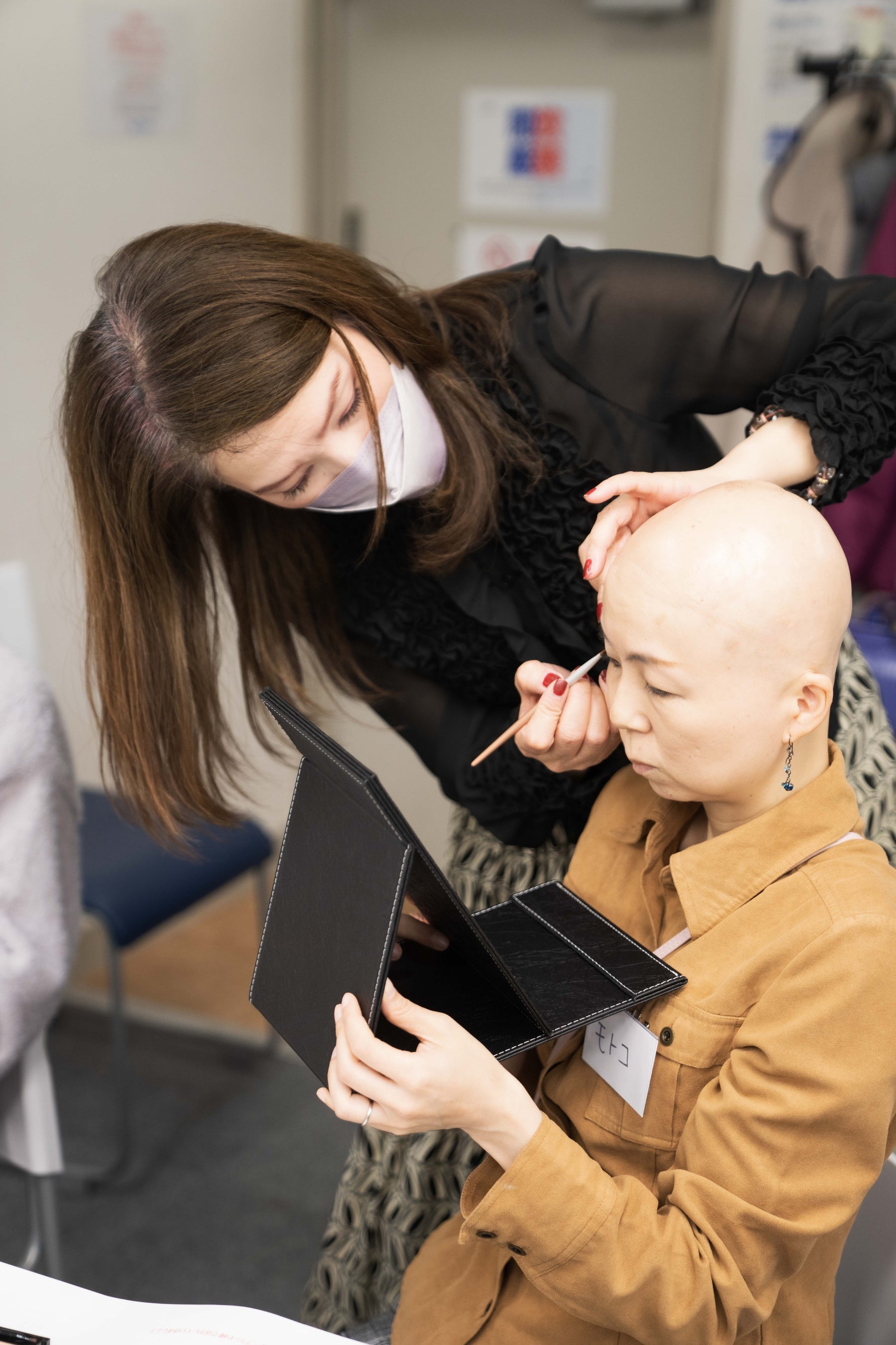 ウィッグを使⽤する⼈にとって、もみあげや産⽑がないため不⾃然感が出てしまうところをメイクでカバーできる⽅法を教えてもらっている様子。