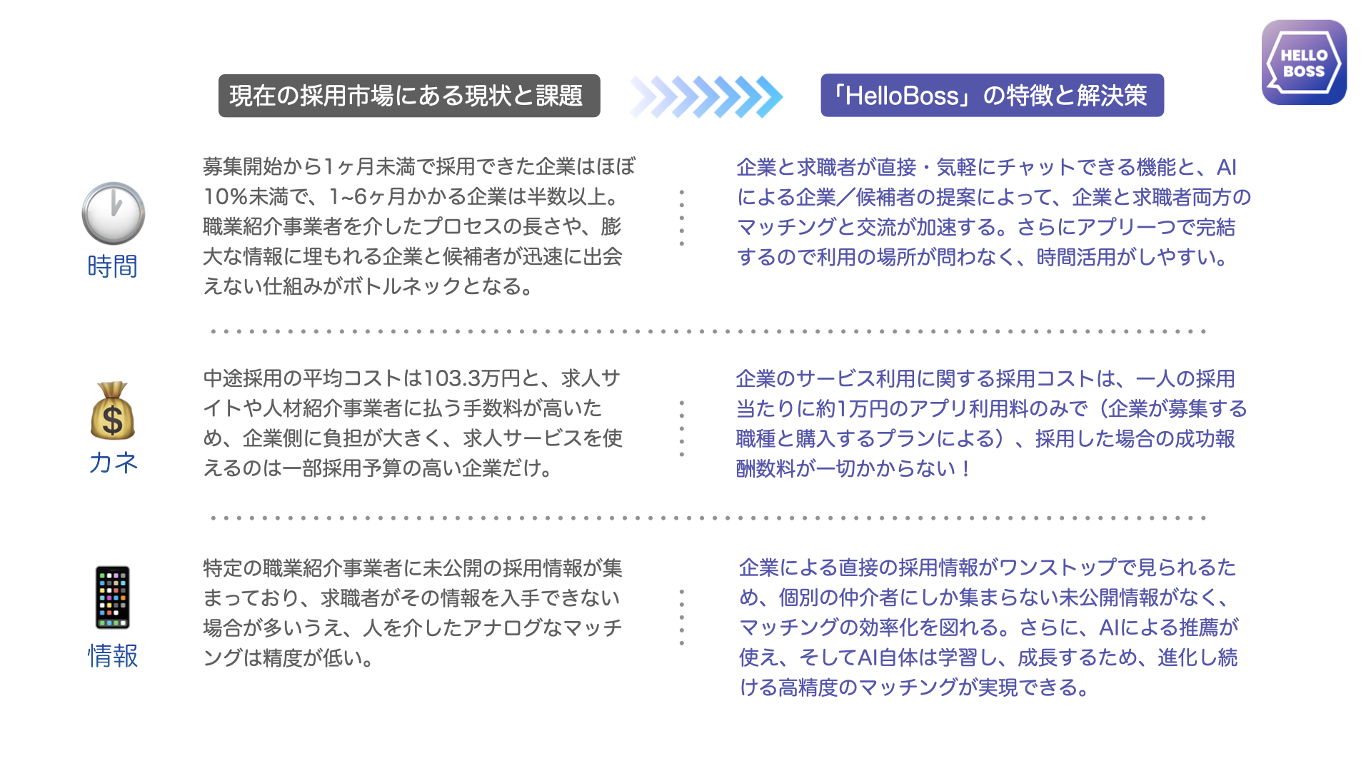 格安の料金プランで企業と求職者を直接つなぎ、さらにAIを通してマッチングを加速させ、そしてマッチングの精度を高めることで、従来の費用の高さで求人サイトや人材紹介の利用を仕方なく諦めていた多くの中小企業を含めた、全ての企業に新たな採用ソリューションを提供します。『HelloBoss』は、企業側の一人あたりの平均採用コストを従来の数十万円(新卒採用93.6万円、中途採用103.3万円*)から1万円以下(『HelloBoss』の利用料のみで考える場合)、応募から内定までの採用期間を従来の数ヶ月(中途採用の場合は募集開始から1ヶ月未満で採用できた企業はほぼ10%未満で、1ー6ヶ月かかる企業は半数以上**)から最短1ー2週間以内に抑えることの実現を目指します。