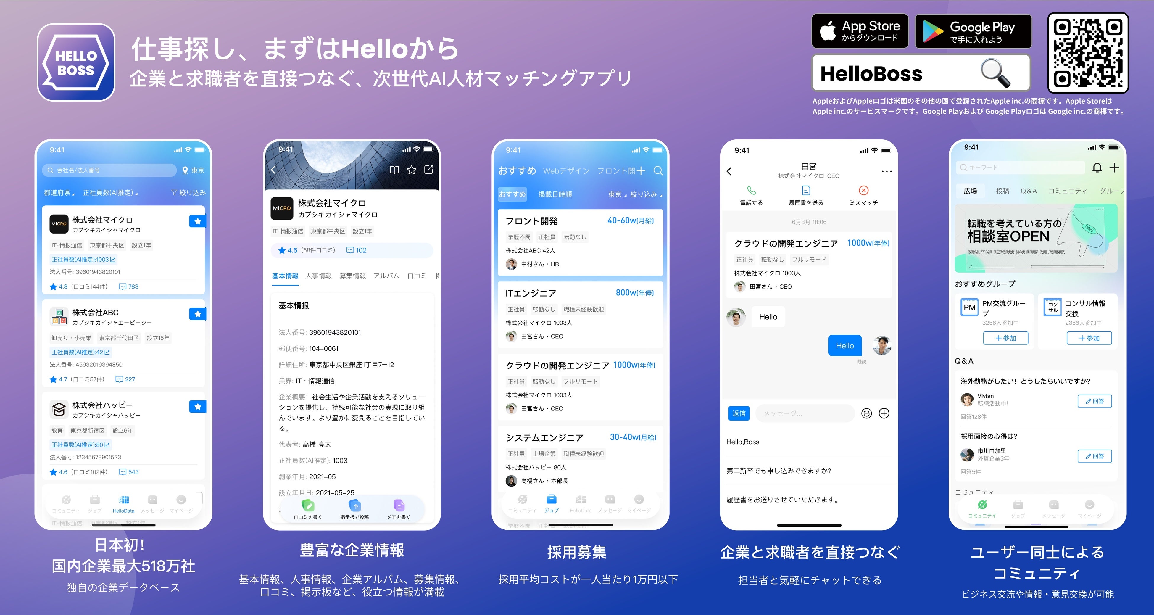 次世代アプリを開発・運営する株式会社NGA(本社:東京都港区、CEO:王沁、以下「NGA」)は、このたび、サッカー選手兼監督の本田圭佑氏率いる個人ファンド「KSK Angel Fund LLC」(本社:アメリカ合衆国カリフォルニア州、以下「KSK」)より資金調達を実施することに伴い、独自のAIアルゴリズムとビジネスモデルが実装された次世代採用アプリ『HelloBoss』のβ版をリリースすることを発表します。シードラウンドでは、KSKのほか、複数の既存投資家も追加出資し、累計8800万円の資金調達を完了しました。本日、NGAは『HelloBoss』β版の初期機能を公開し、従来の採用サービスの仕組みに対して変革を起こし、日本の労働市場の重要課題である人材流動性の乏しさを解決しようとする新たな事業をスタートします。