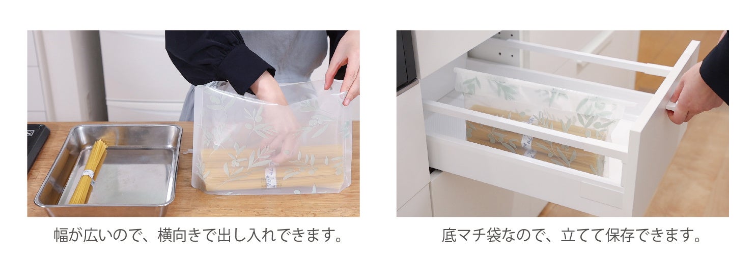 間口が広いので、そばやうどん、そうめんの束を横向きで出し入れすることができます(長さ約18㎝までの乾麺)。また、広い間口でもエニーロックをスライドするだけでスピーディに開け閉めすることができ、空気やにおいを遮断した状態で保存することができます。底マチ袋なので袋を立てた状態で保存できます。