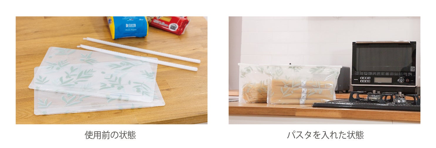 スパゲティ用は、細身のスティックタイプのエニーロックと、半透明の透明蒸着PETを含んだ3層フィルムの底マチ袋のセットです。