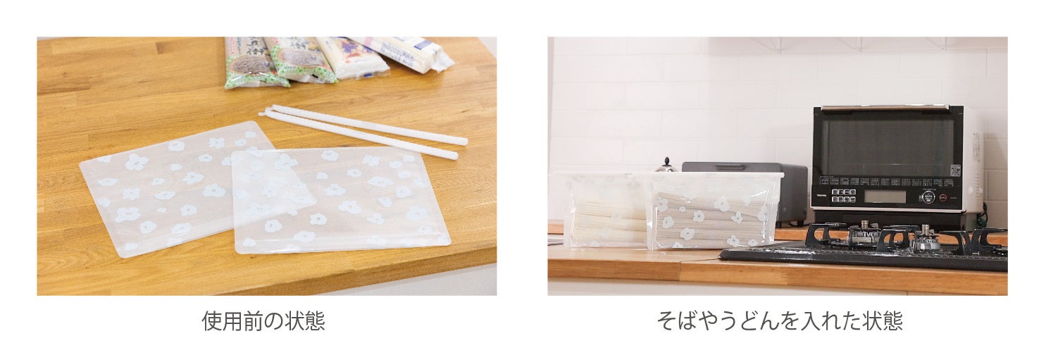 そば・うどん用は、細身のスティックタイプのエニーロックと、半透明の透明蒸着PETを含んだ3層フィルムの底マチ袋のセットです。