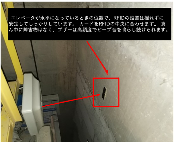 | RFID,光電スイッチ(オプション)をエレベータの塔内の壁に階ごとに接着。エレベータが停止し乗降時に読み取り対抗するRFIDをリーダが呼び出し、その時の籠の階数を検知。 エイムテクノロジージが用意したAWSクラウドとは4Gネットワークで接続し、アダプタとはLORA通信で接続し、ロボットからのフロア移動のリクエスト、ログ情報などをやり取りします。 |