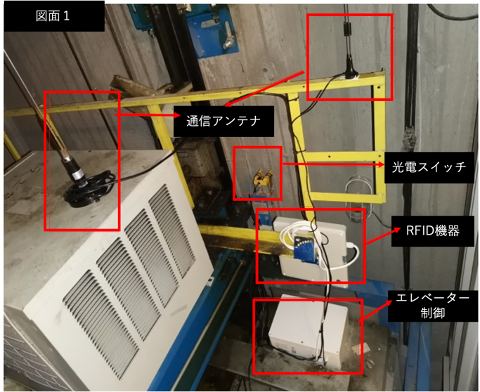 籠の外の上か下のスペースに設置し、ロボットからの指示を受け、制御盤の階数ボタン、ドアの開きボタン(閉じボタンはリスク回避のため触りません)をアクティベートすることと、エレベータが今どこの階にいるかフロアの識別できるために昇降路に貼り付けたRFIDを読むためのRFIDリーダと接続します。AWSサーバおよびロボットとは4GネットワークとLPWA(Low Power Wide Area)通信のLORA無線送信を介してエレベータの籠の中にいるロボットと会話します。