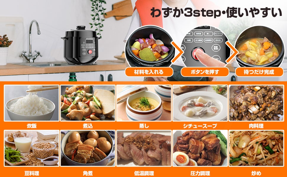 1台10役でマルチに使える電気圧力鍋発売。操作簡単・時短調理。わずか3stepで、毎日簡単且つ時短で美味しい料理を作り出す。