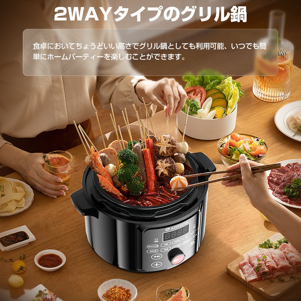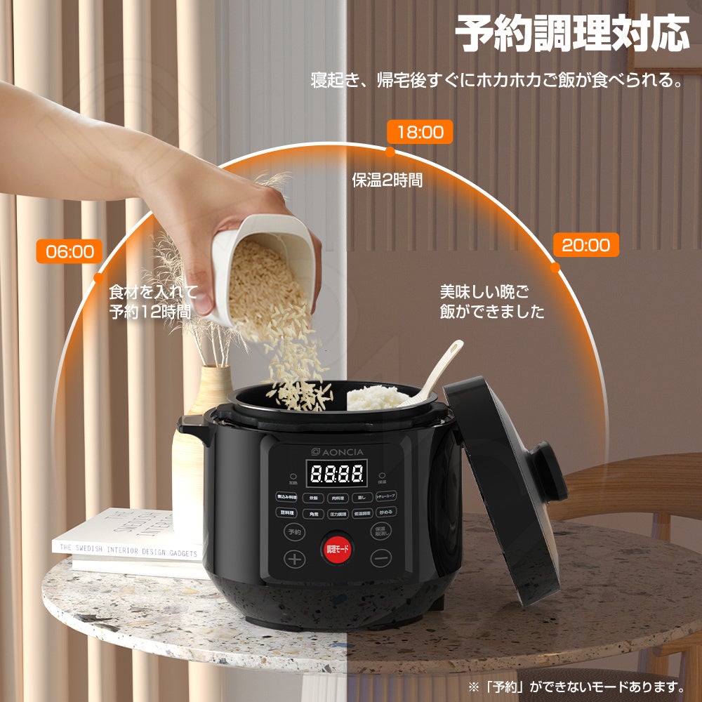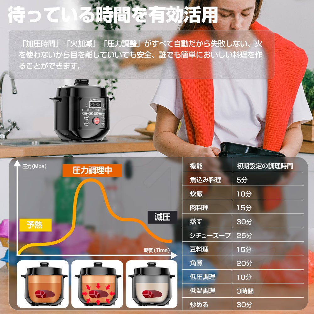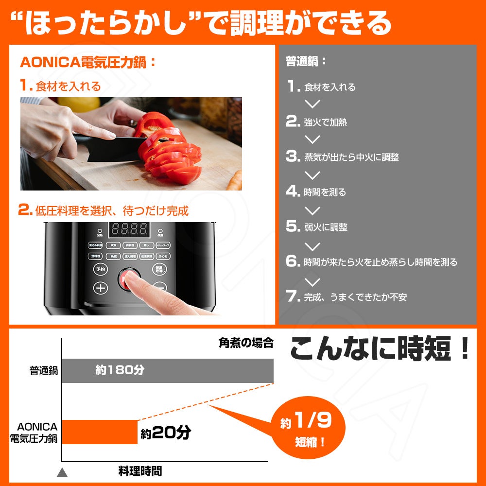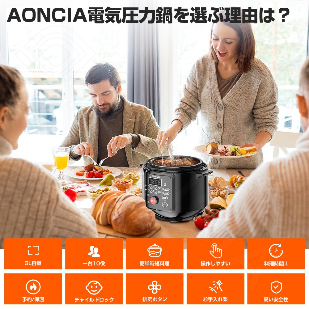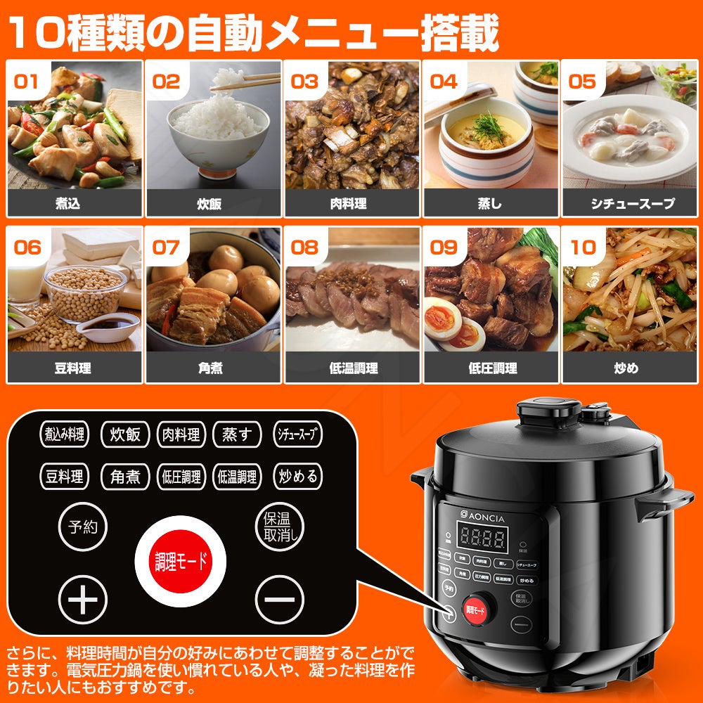 AONCIA電気圧力鍋には炊飯/煮込/蒸し/シチュースープ/肉料理/豆料理/角煮/低温調理/圧力調理/炒め、10つの調理モードがあり、様々な料理がこれ1台で完成できます。