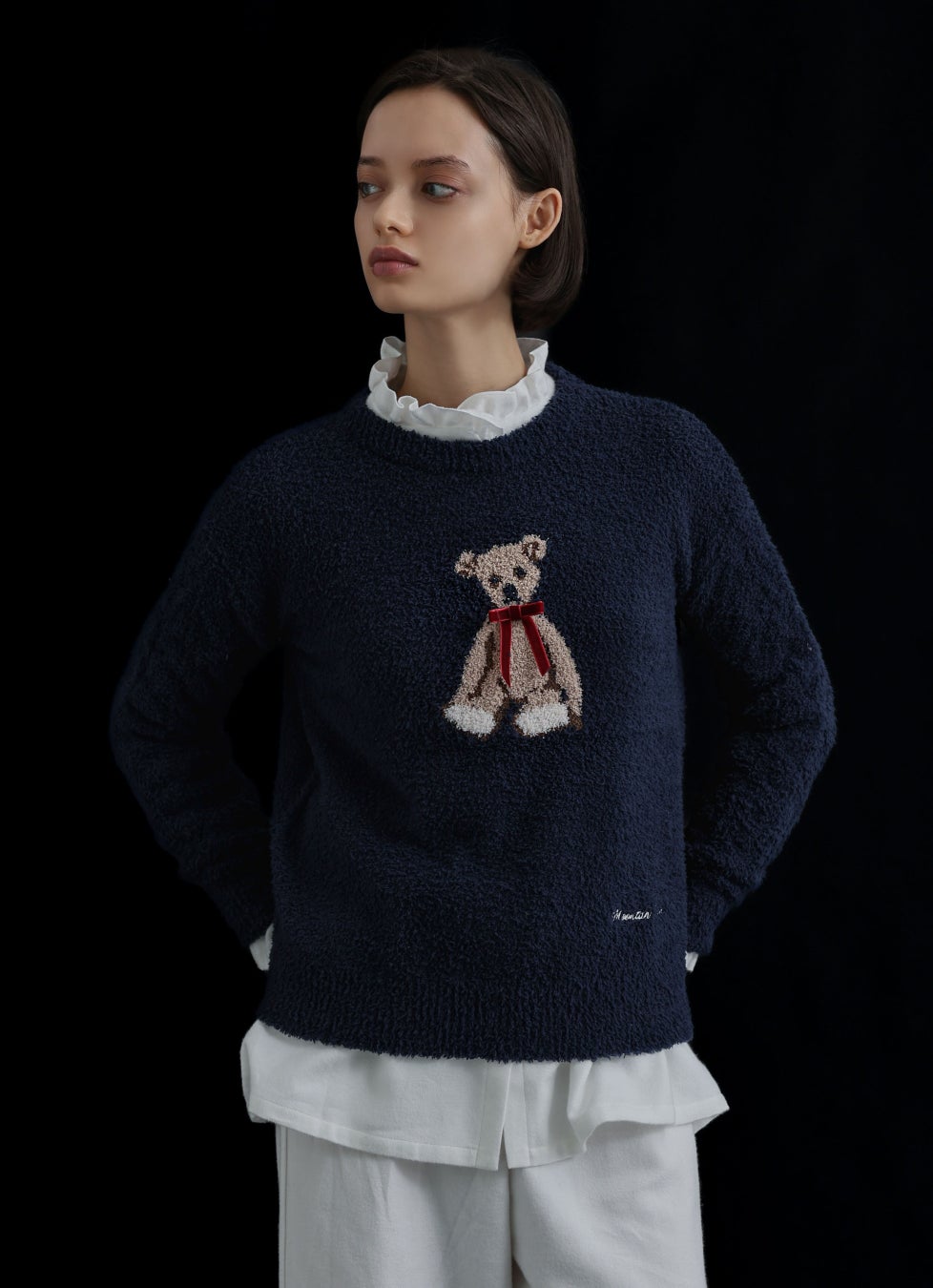 赤いリボンをつけたテディベアが愛らしい、ニットトップス。一枚ではもちろん、薄手のトップスをインナーに重ねたスタイリングも映えます。