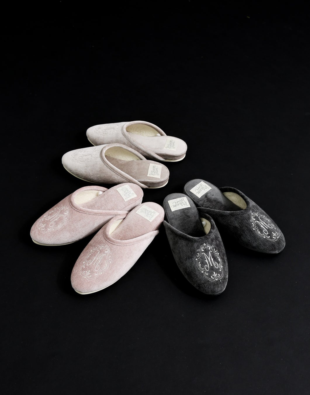 ”M”のイニシャル刺繍を施したクラシカルなヒールスリッパ。宮城県蔵王町で丁寧に作られている日本製スリッパで、へたりづらくクッション性があるため足の負担を軽減し長時間履いても疲れにくい仕様に。