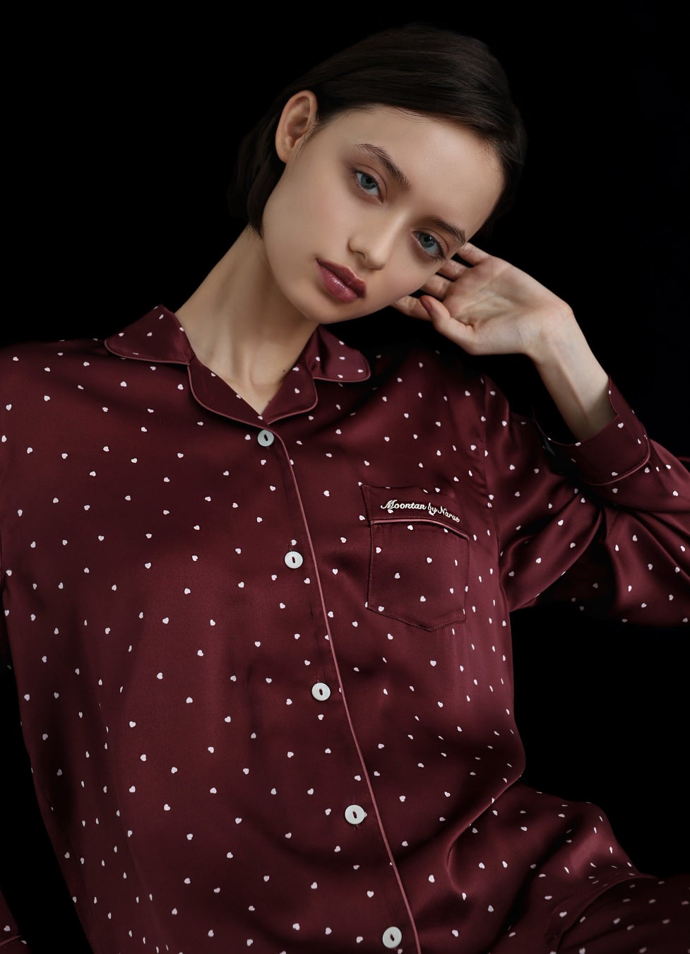 小さなハートのプリントとポケットのブランドロゴ刺繍がポイントのシャツパジャマ。