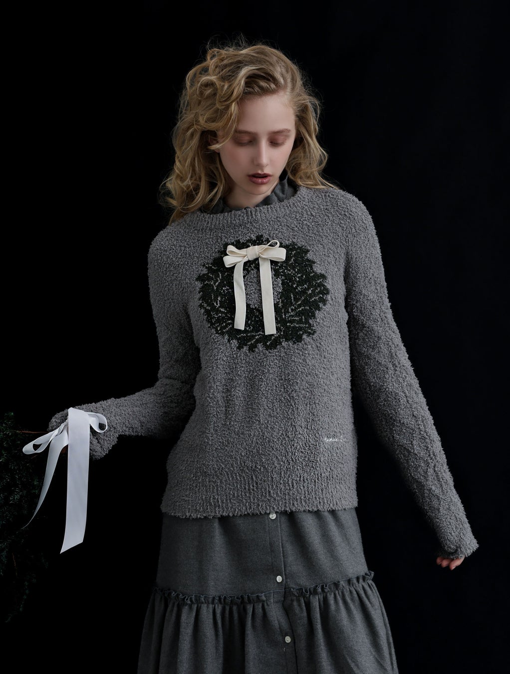 リースの柄に大きなリボンを添えたデザインのニットトップス。