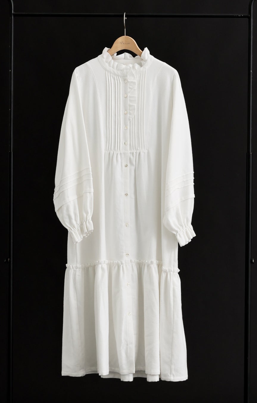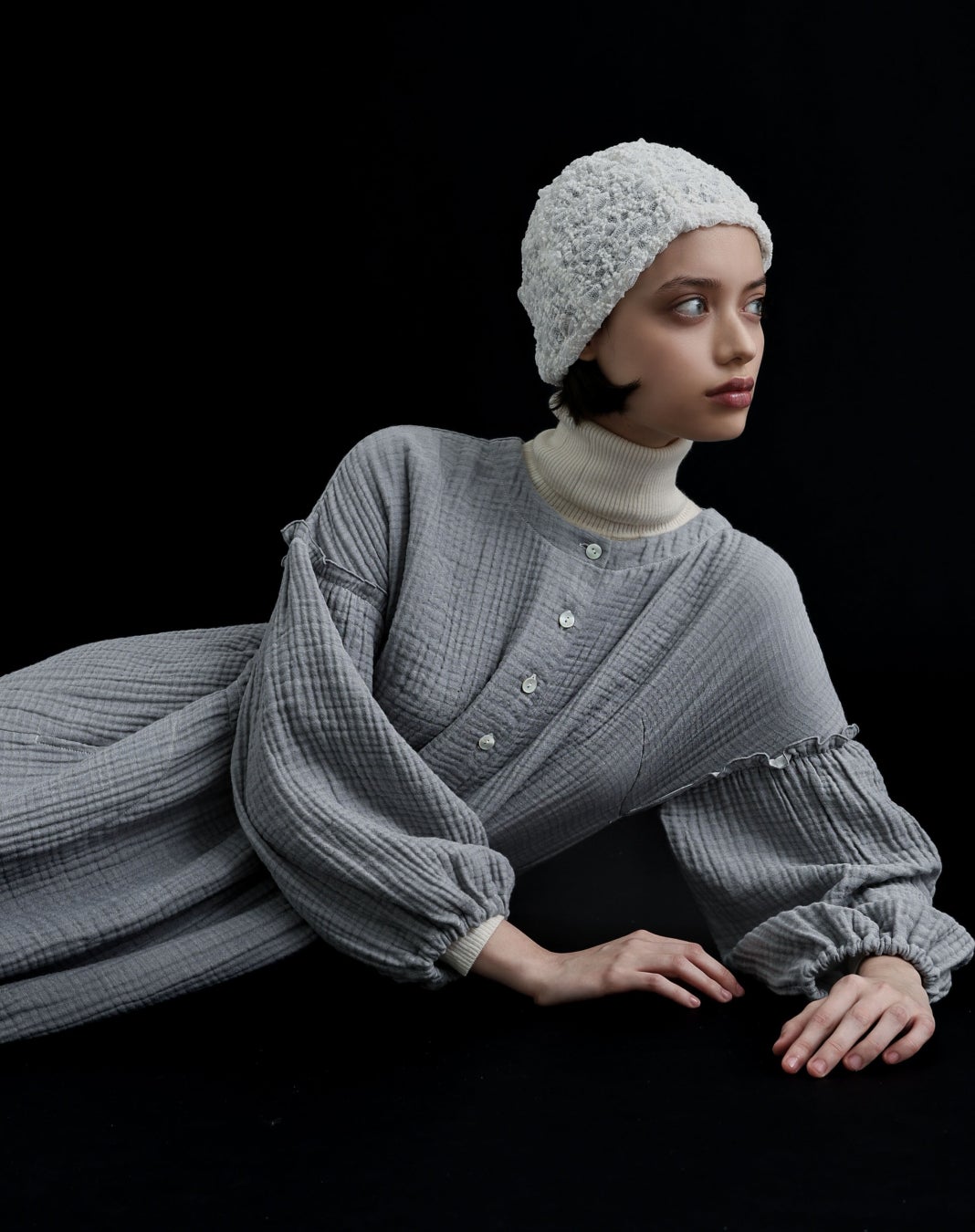 4重ガーゼの空気を含んだふっくらとした風合いが、素肌にやさしく寄り添うワンピース。前開きのデザインに並ぶ上品な貝ボタンがポイントです。