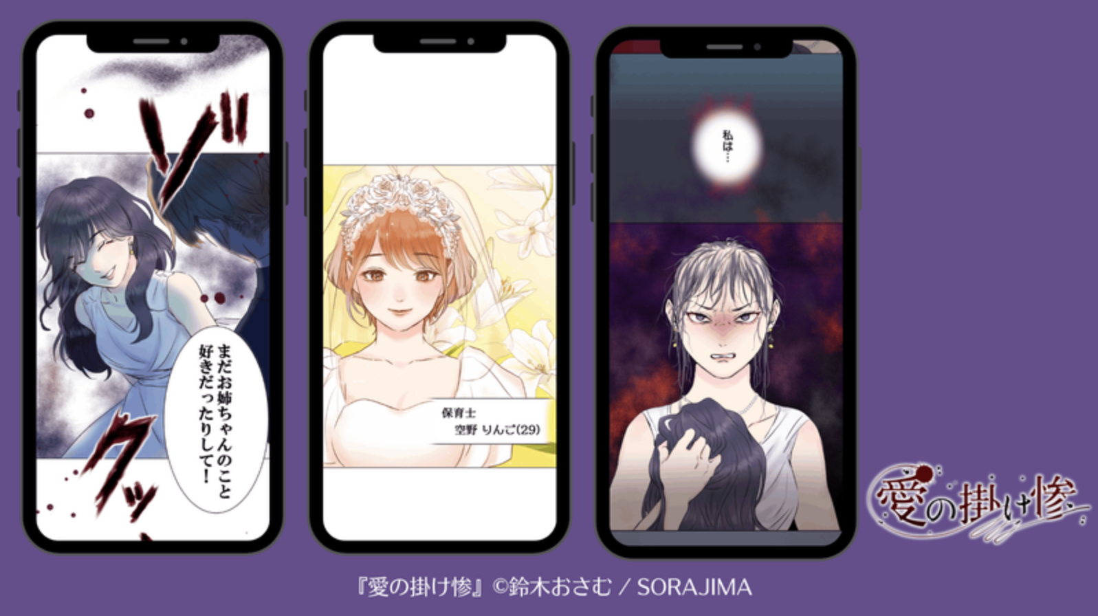 放送作家・鈴木おさむ氏とSORAJIMA(株式会社ソラジマ)が共同制作した新作webtoon『愛の掛け惨』が、2022年11月2日、LINEマンガ(LINE Digital Frontier株式会社)において連載を開始しました。見どころ満載で多くの読者を惹きつける、注目の作品となっており、リリース後には新着ランキング1位を獲得しました。