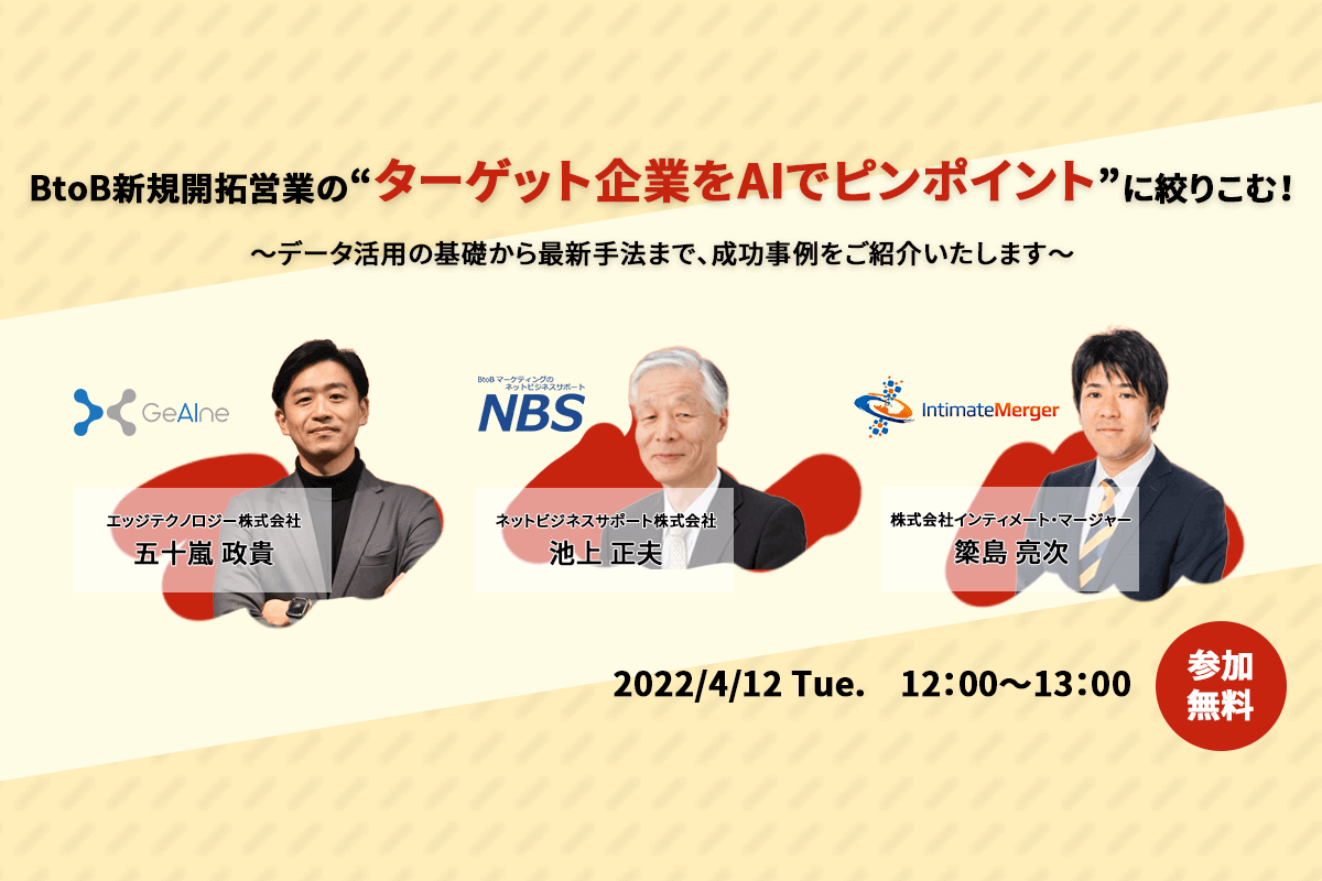 また、本サービスの提供開始を記念して無料Webセミナー「BtoB新規開拓営業のターゲット企業をAI活用でピンポイントに絞りこむ!」を4月12日(火)12時00分より開催します。