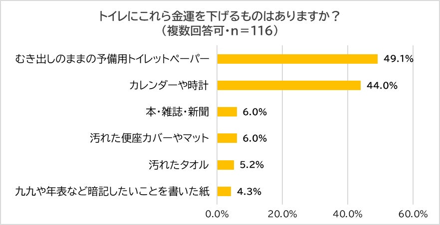 今度は「トイレに金運を下げるものがあるか?」尋ねたら、61.2%が「ない」と回答。何かしらある38.8%に「何があるのか?」尋ねたところ、約半数の人が「むき出しのままの予備用トイレットペーパー」(49.1%)と回答し最多。次点の「カレンダーや時計」も44.0%いました。