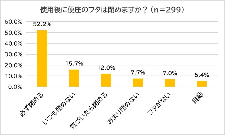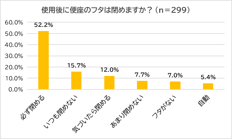 最後に「使用後、便座のフタを閉めるか?」尋ねました。半数以上が「必ず閉める」(52.2%)と回答しましたが、「フタがない」(7.0%)ため物理的に閉めることができない人、「いつも閉めない」(15.7%)、「気づいたら閉める」(12.0%)、「あまり閉めない」(7.7%)など42.1%が使用後にフタが開けっ放しの状態があることがわかりました。