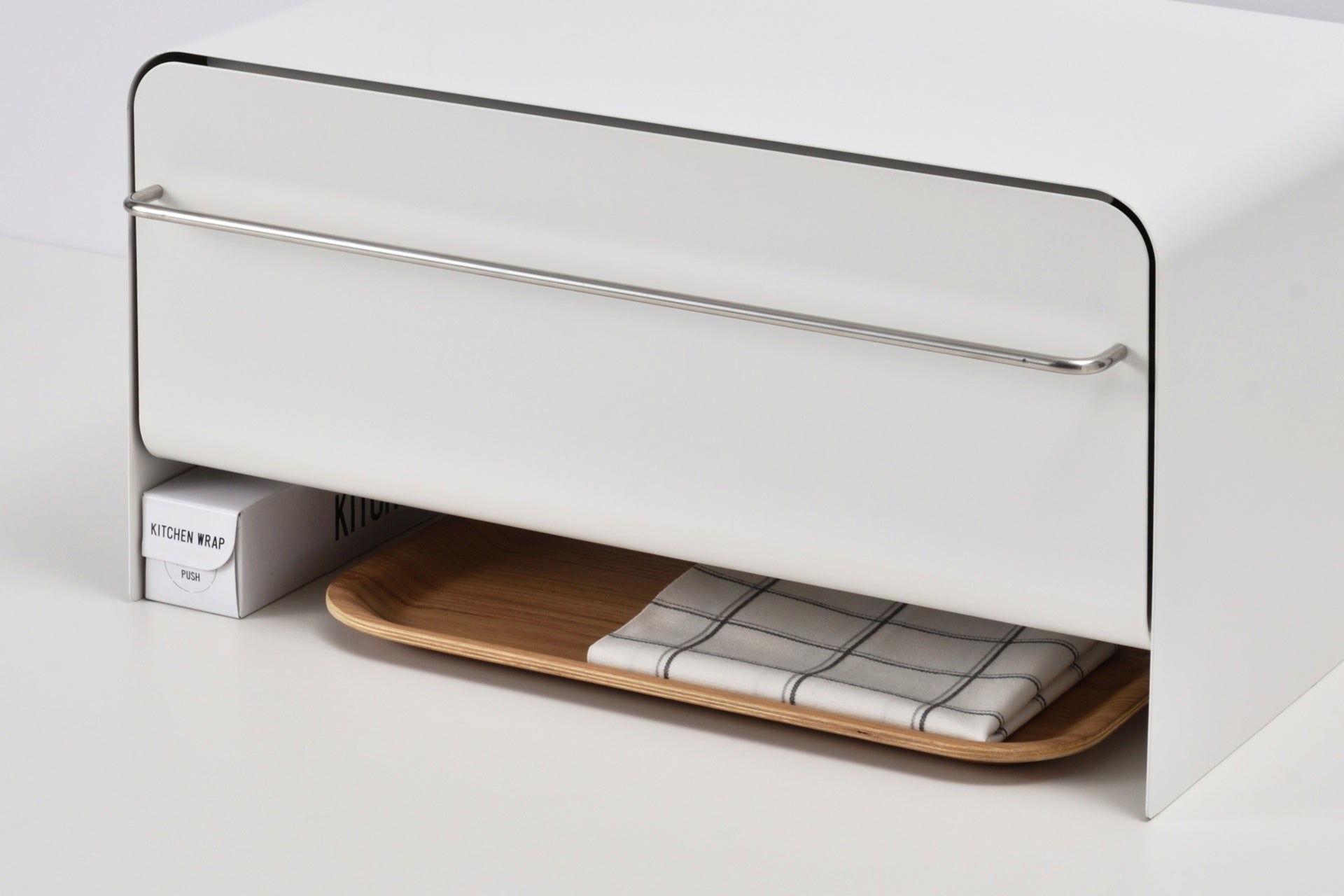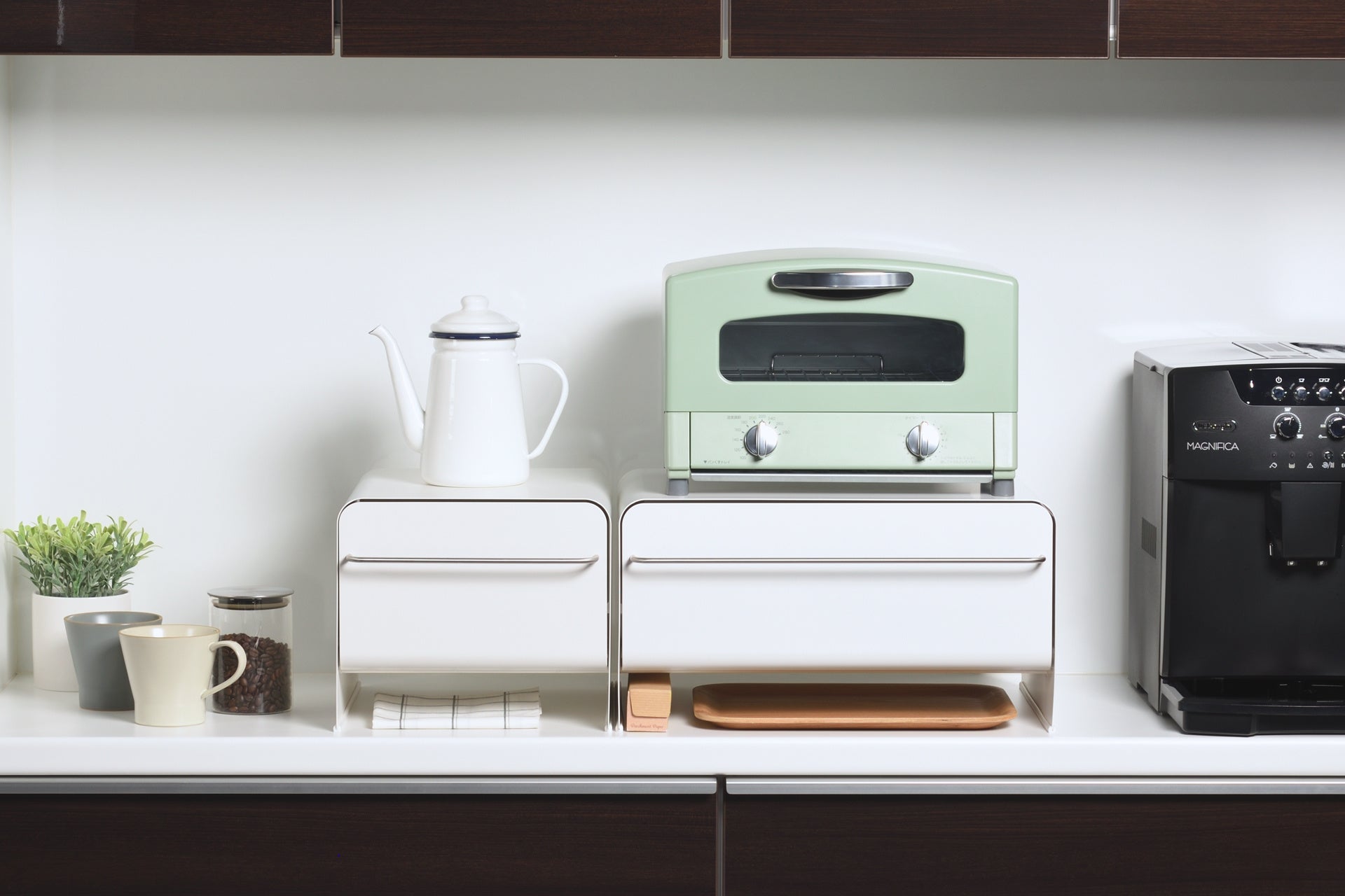 トースター回りはパンやコーヒーグッズ、瓶や缶などとにかく細かい物が集まりやすい場所。いつの間にかカウンターの上が物だらけになってしまう悩みを解消させるこちらのブレッドドロワー。