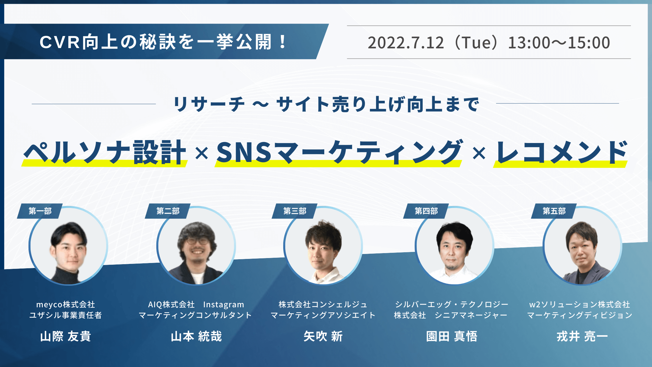シルバーエッグ・テクノロジーは、2022年7月12日(火)にw2ソリューションが主催するウェビナー「CVR向上の秘訣を一挙公開! 【リサーチ~サイト売り上げ向上まで】 ペルソナ設計×SNSマーケティング×レコメンド」に登壇します。