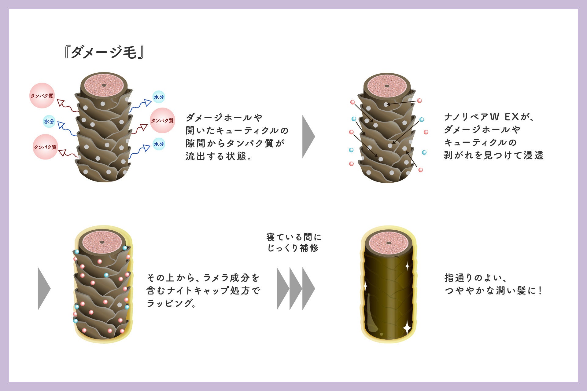 一度ダメージを受けた髪は、ダメージホールと呼ばれる空洞ができます。髪本来の力では空洞の補修ができないだけでなく、摩擦など外的刺激も受けやすいため、毎日のヘアケアが重要です。ナノカプセル化した2種類の毛髪補修成分を独自比率で組み合わせた「ナノリペアW EX(※2)」が、ダメージセンサー機能でダメージホールを探して効率的に浸透し、髪を内側から補修します。